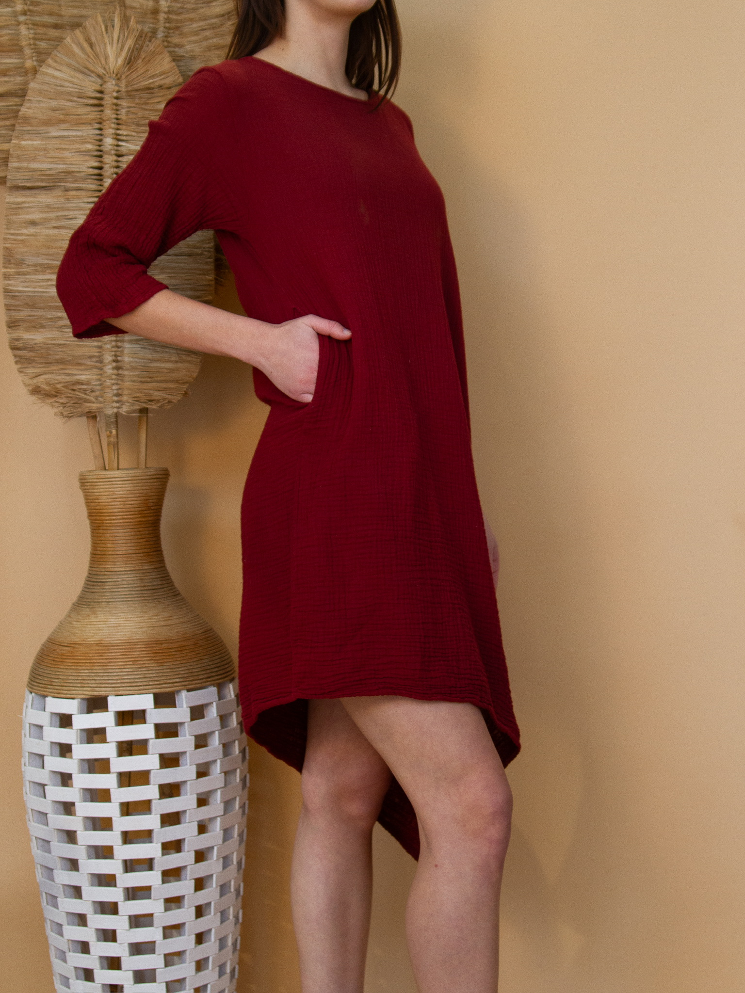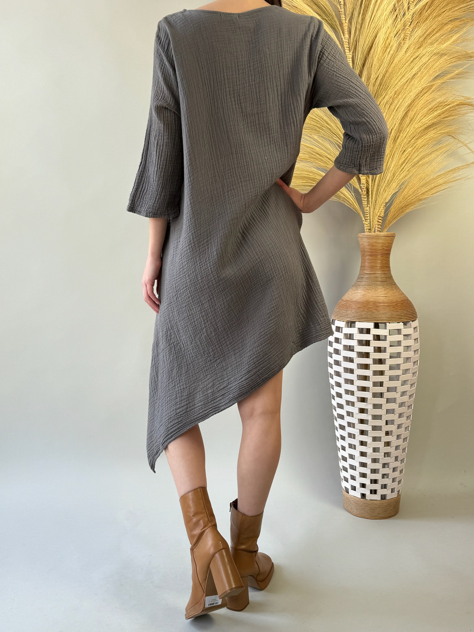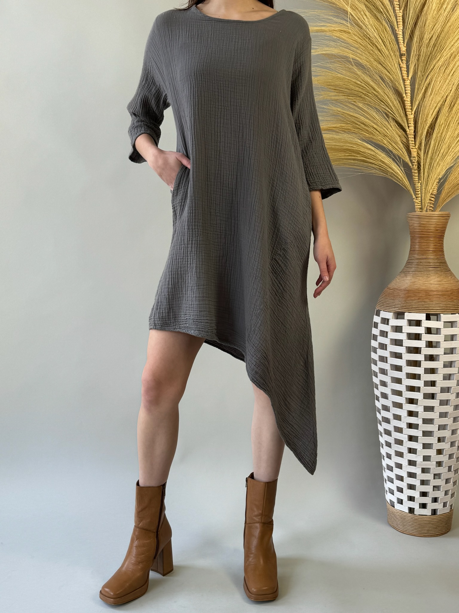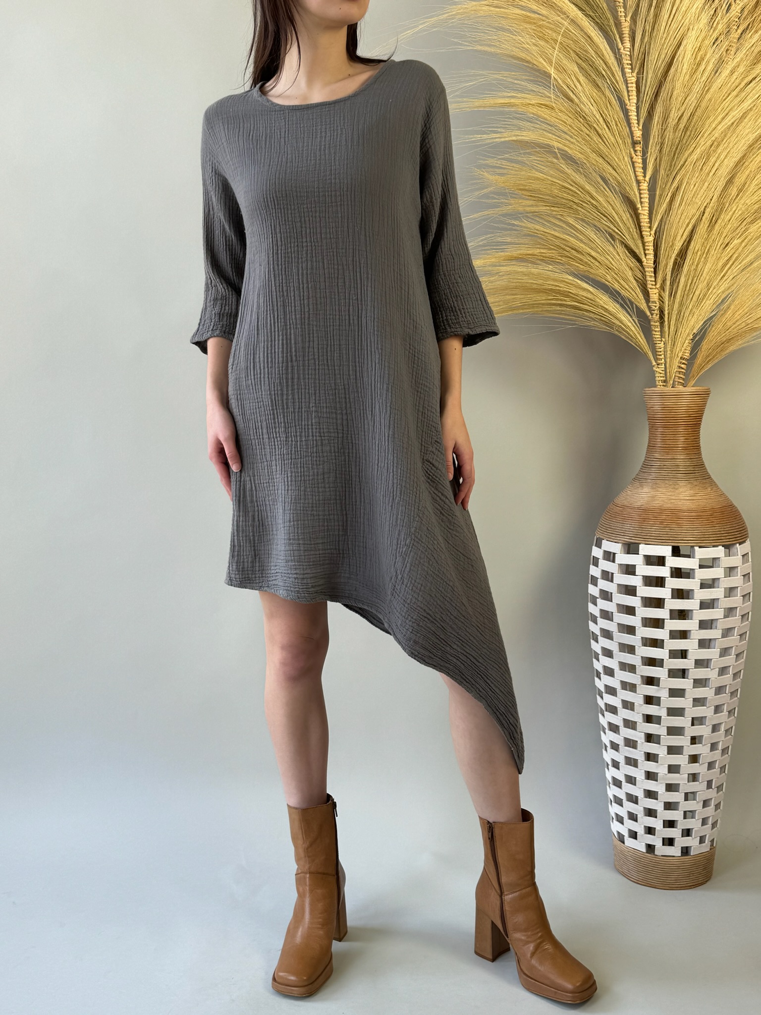 Our 3/4 Sleeve Long Dress is a dressy addition to your wardrobe crafted from elegant gauze fabric. With its asymmetrical hemline and classic crew neck, this dress exudes timeless charm. Perfect for any occasion, from casual outings to special events, it's a versatile and sophisticated choice. Stay effortlessly chic in our 3/4 Sleeve Long Dress, designed to elevate your style with ease.