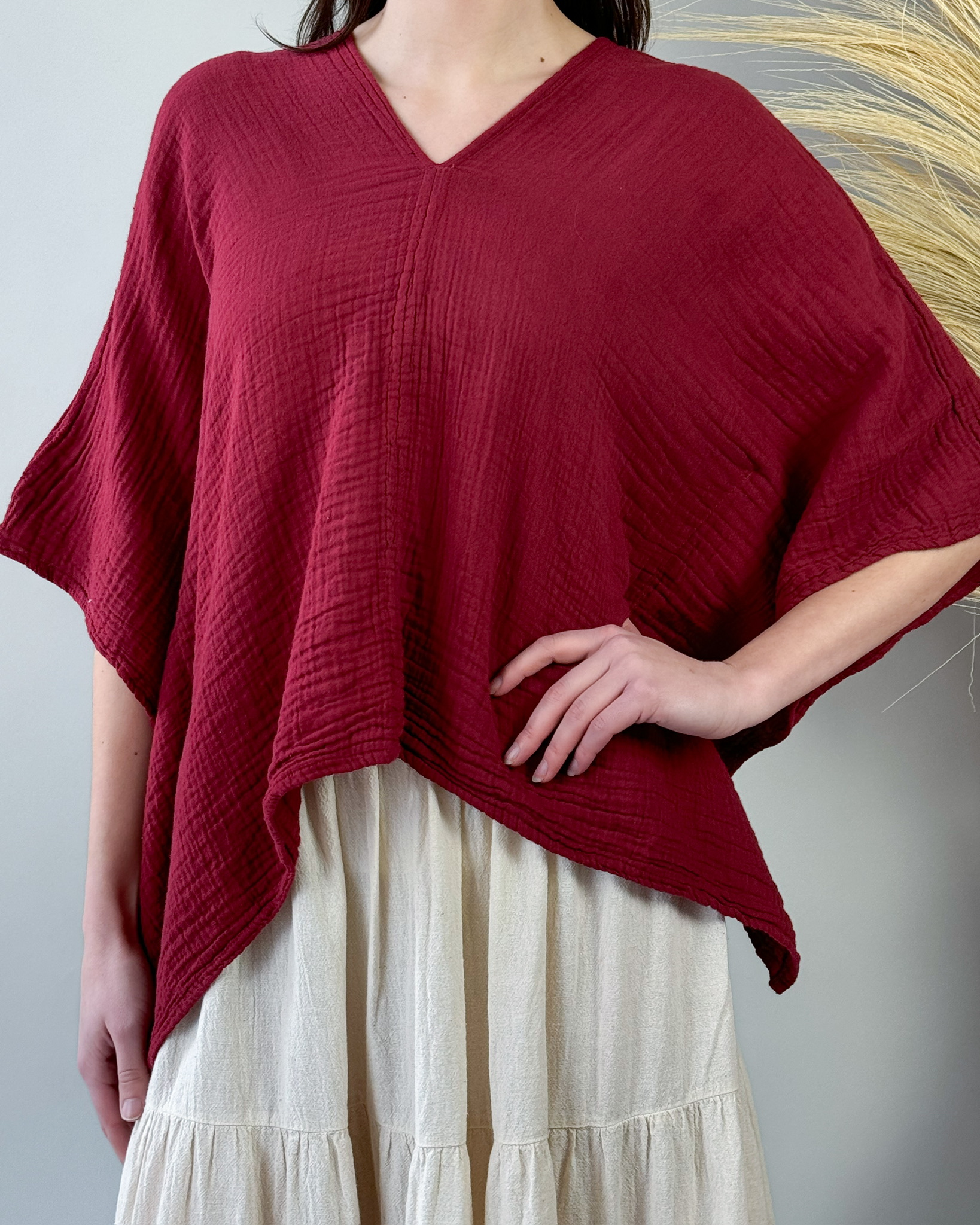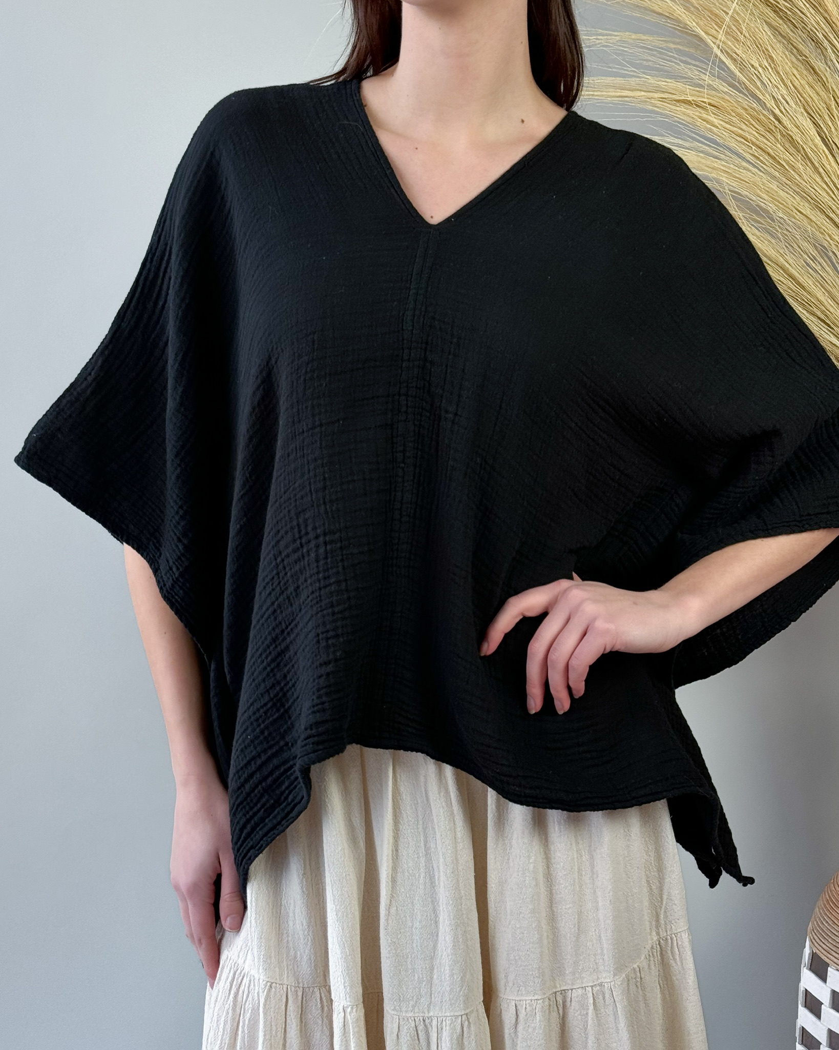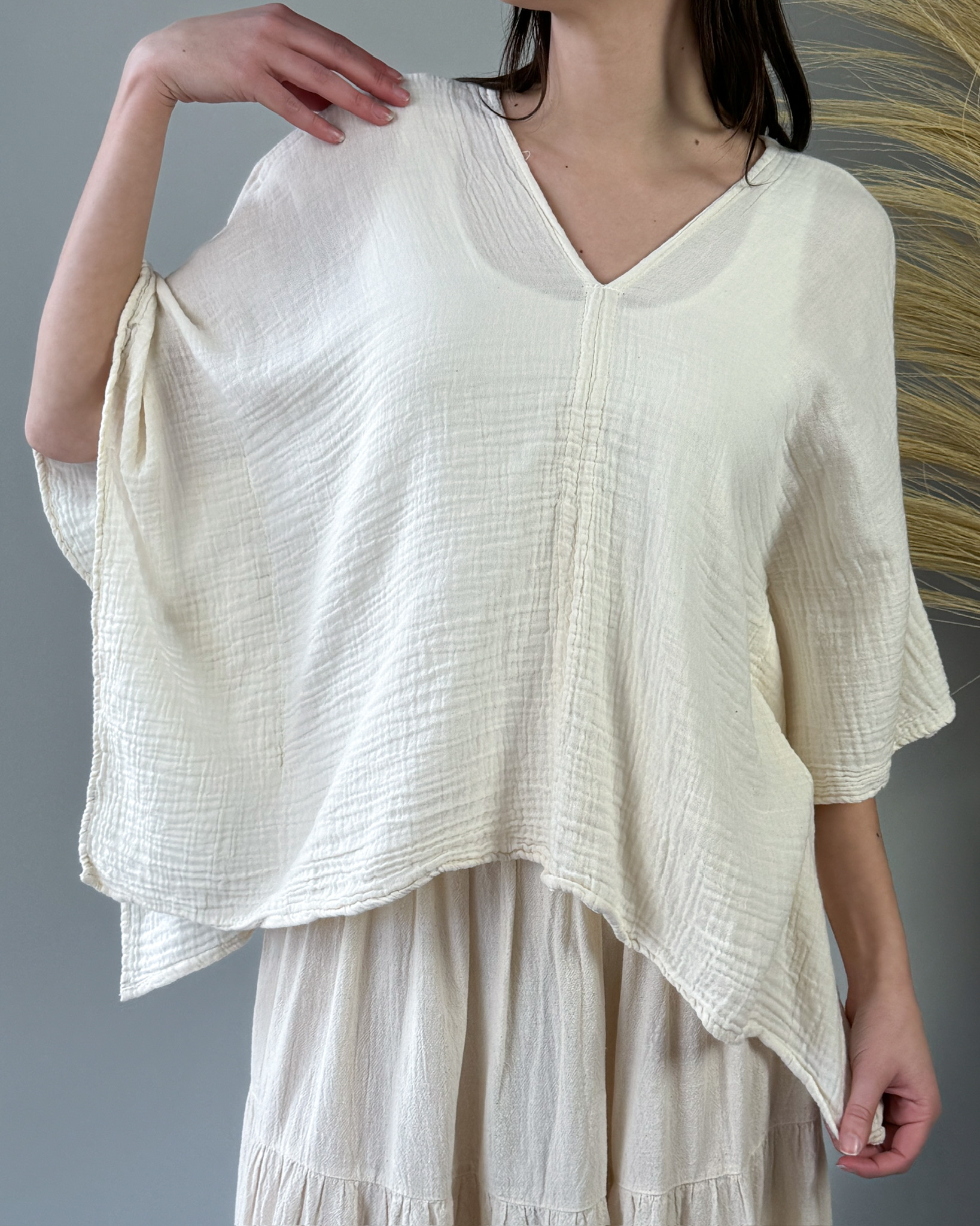 Our Butterfly Gauze Poncho is a breezy oversized piece designed for effortless style. With its v-neck design and airy gauze fabric, this poncho exudes relaxed elegance. Perfect for layering over your favorite outfit or wearing on its own, it adds a touch of bohemian charm to any look. Whether you're attending an event or strolling along the beach, the Butterfly Gauze Poncho is sure to become your go-to choice for chic comfort.