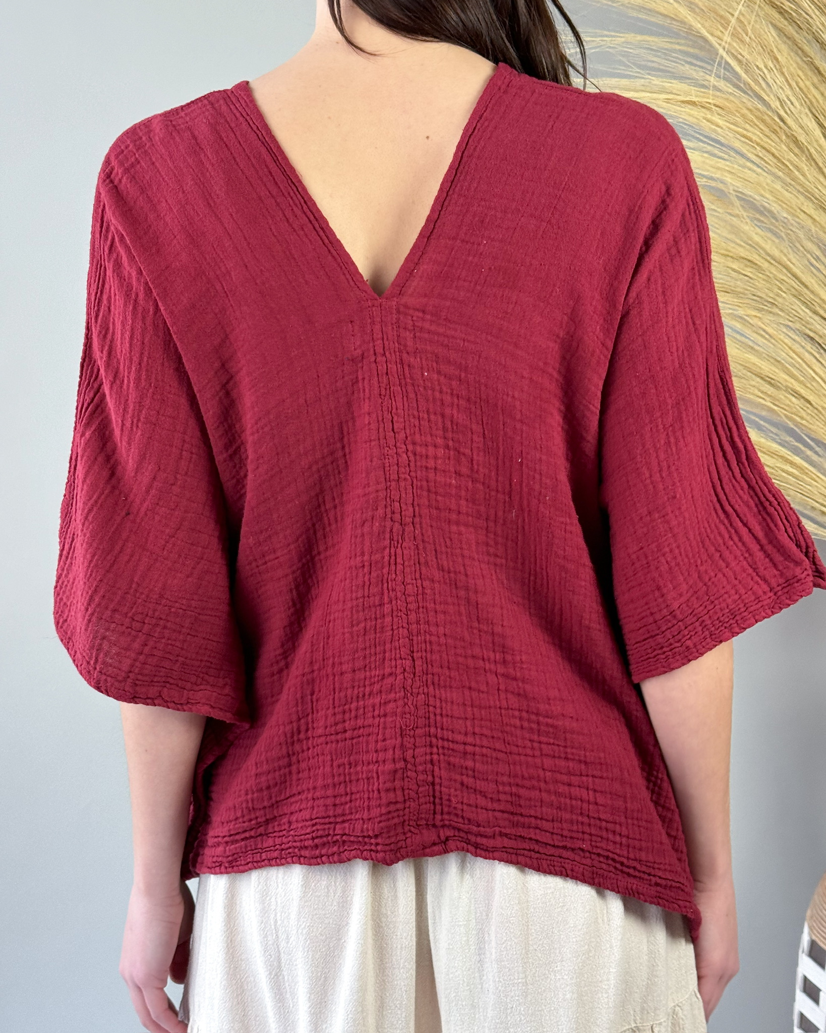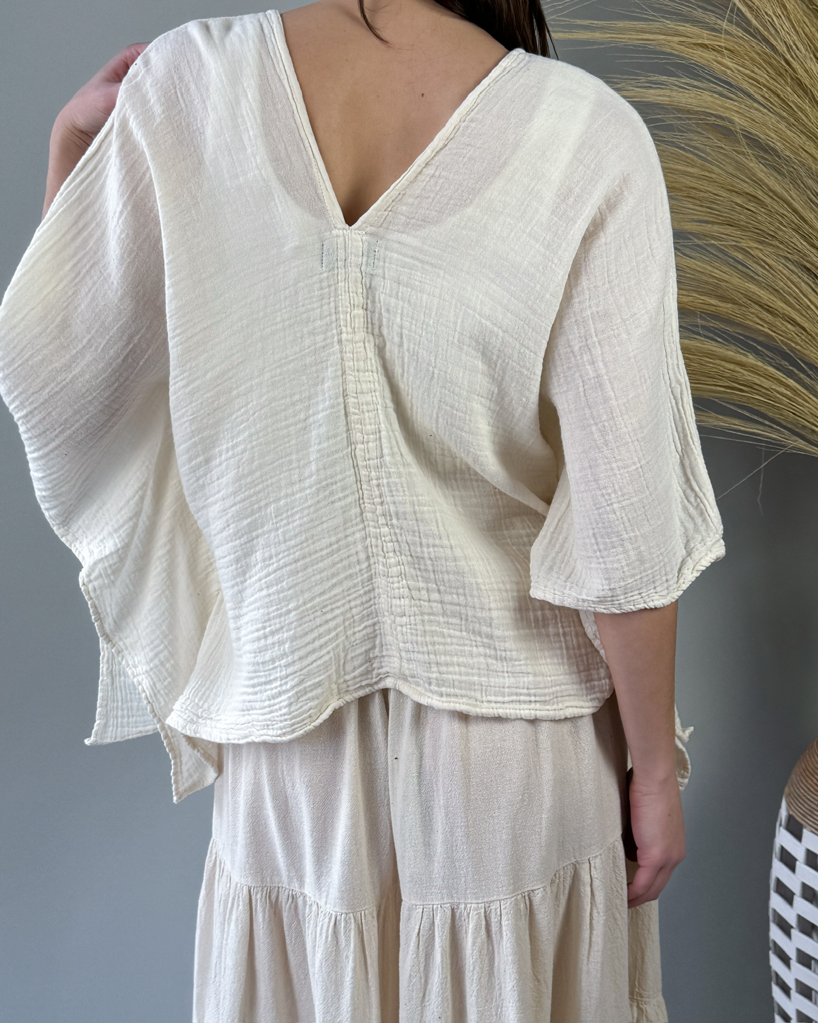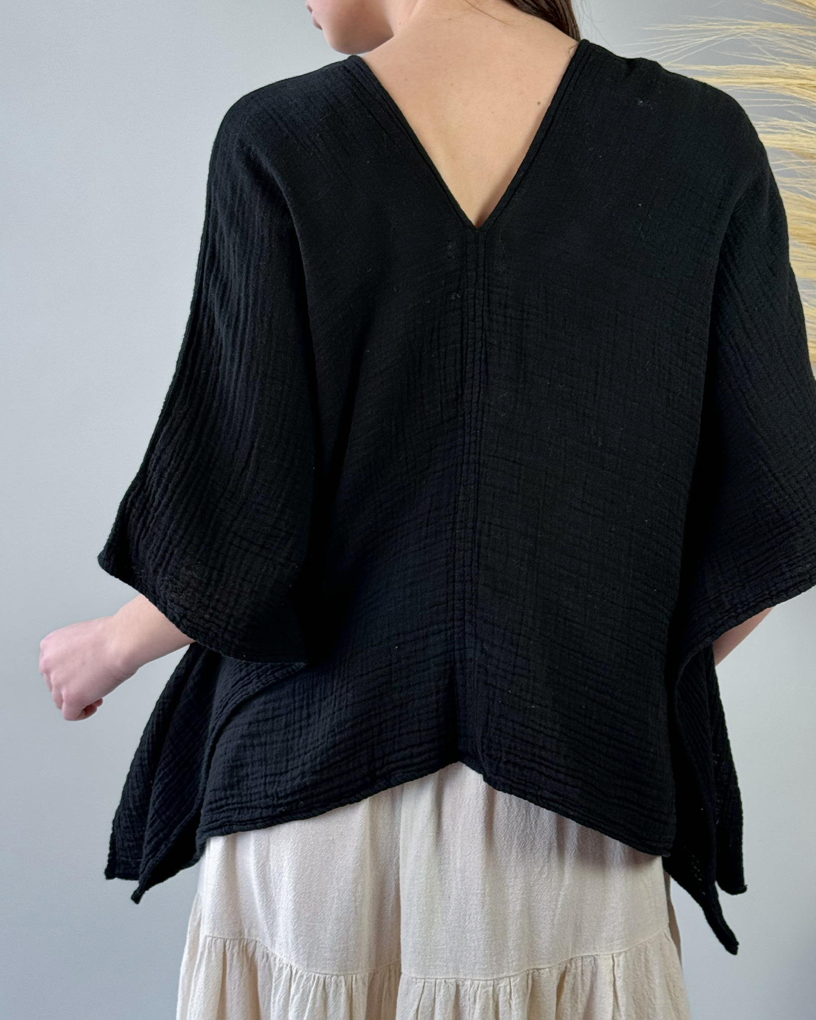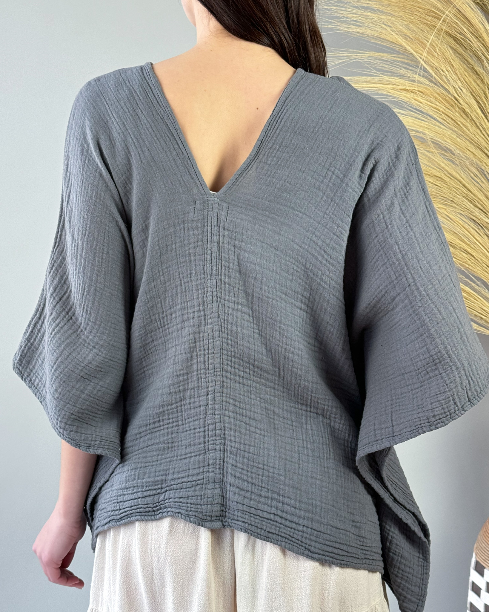 Our Butterfly Gauze Poncho is a breezy oversized piece designed for effortless style. With its v-neck design and airy gauze fabric, this poncho exudes relaxed elegance. Perfect for layering over your favorite outfit or wearing on its own, it adds a touch of bohemian charm to any look. Whether you're attending an event or strolling along the beach, the Butterfly Gauze Poncho is sure to become your go-to choice for chic comfort.