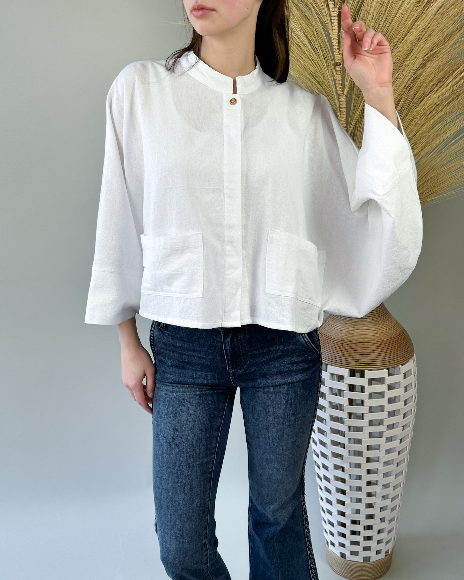 Our Linen Butterfly Button Top, a versatile piece that adds a touch of unique style to our wardrobe. This top features a collarless design, giving it a modern and chic look. Wear it buttoned up for a classic style or open as a cardigan for a more relaxed vibe. With its butterfly-inspired sleeves and endless styling possibilities, this top is sure to become a staple in your collection.