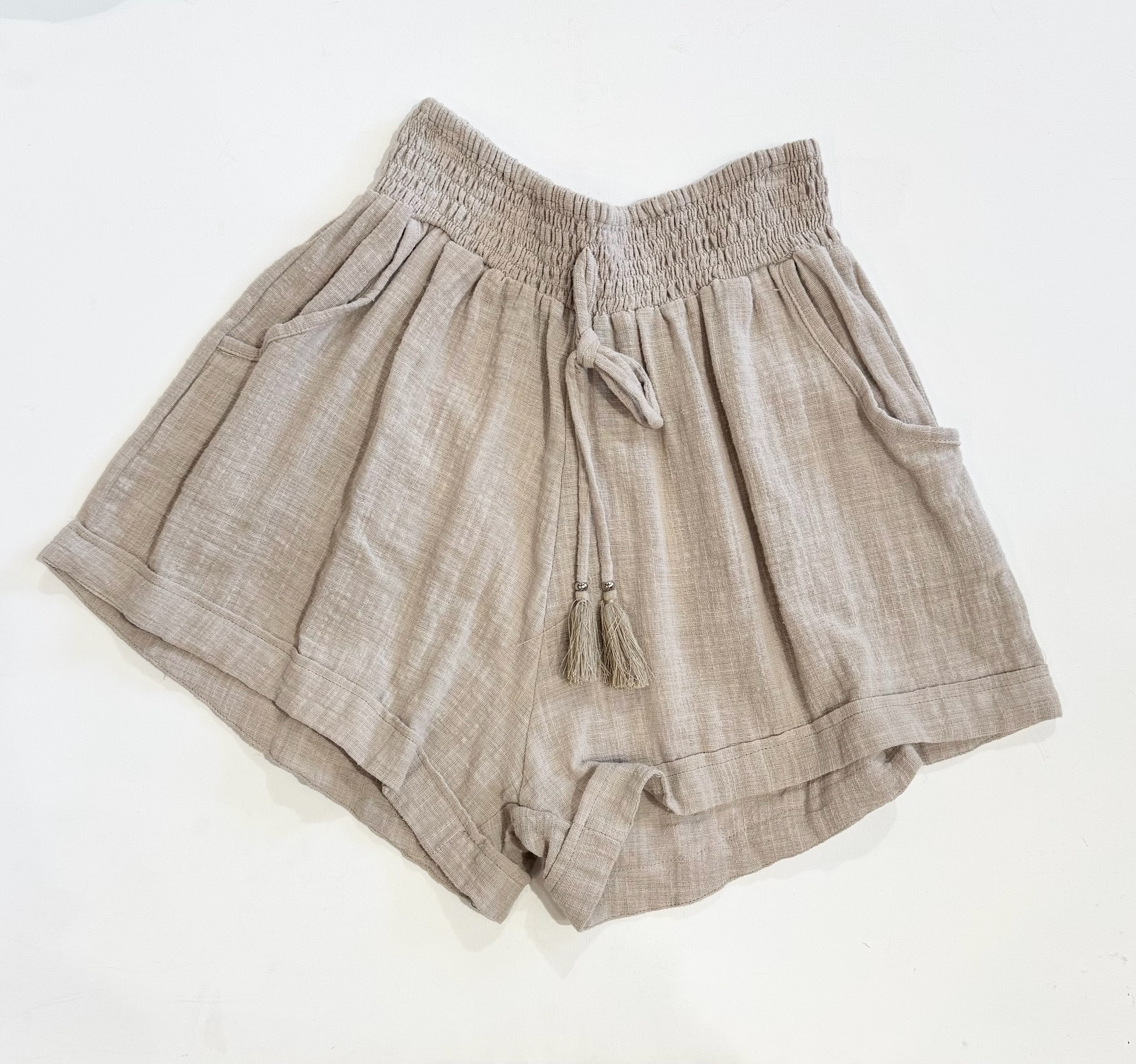 An easy warm-weather staple, these cotton shorts are designed for comfort and relaxed style. The soft, breathable fabric is paired with a smocked elastic waistband and adjustable tie with tassel detail for a flexible fit. Finished with side pockets and a loose, flowy silhouette, they’re perfect for pairing with simple tanks, lightweight blouses, or matching summer tops.