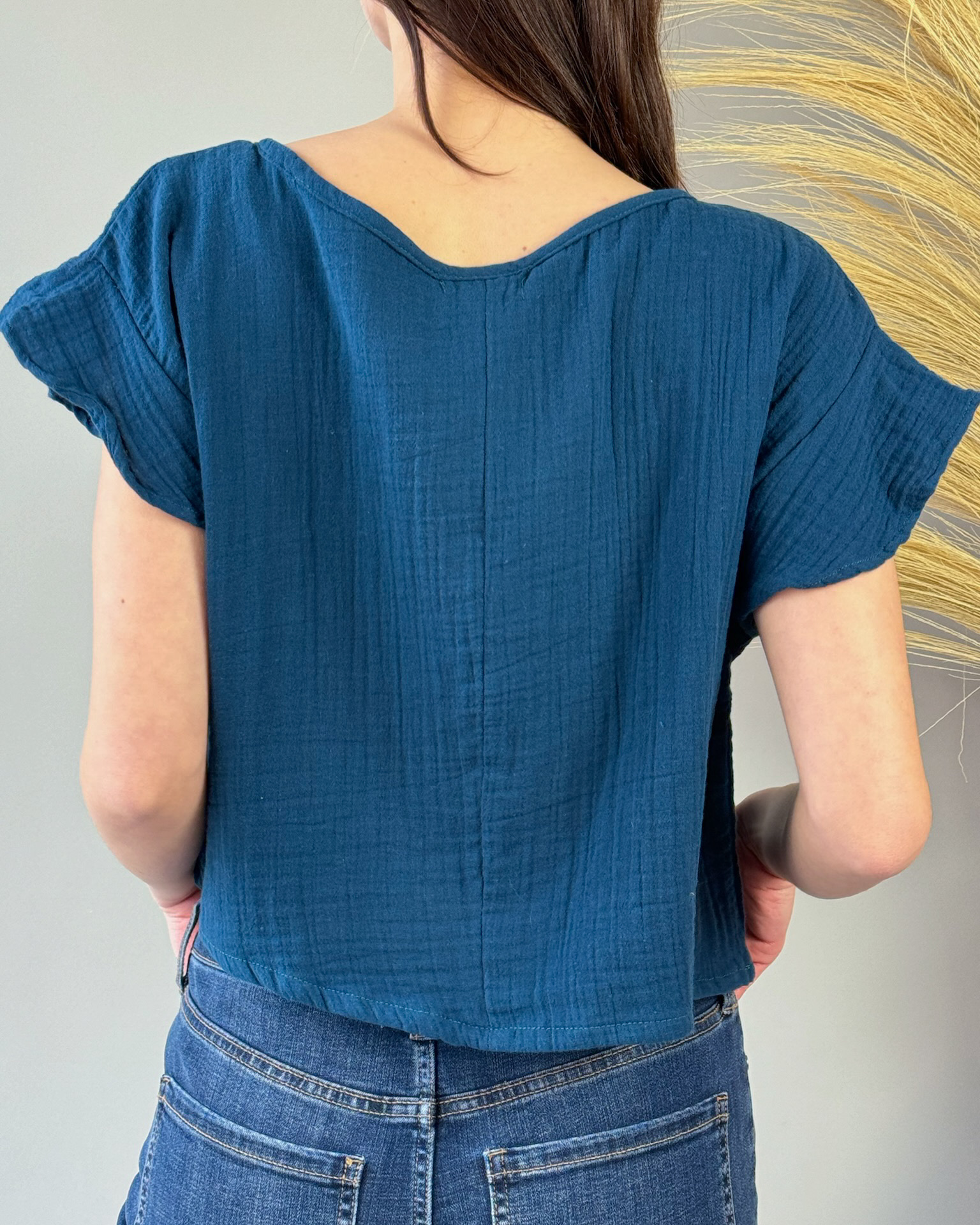 Our Crop Gauze Top is a timeless classic with a modern twist. Featuring short flutter sleeves and a crew neck, this top exudes effortless style and versatility. Crafted from soft and breezy gauze fabric, it's perfect for staying cool and chic on warmer days. Pair it with high-waisted bottoms for a stylish ensemble that's sure to turn heads.