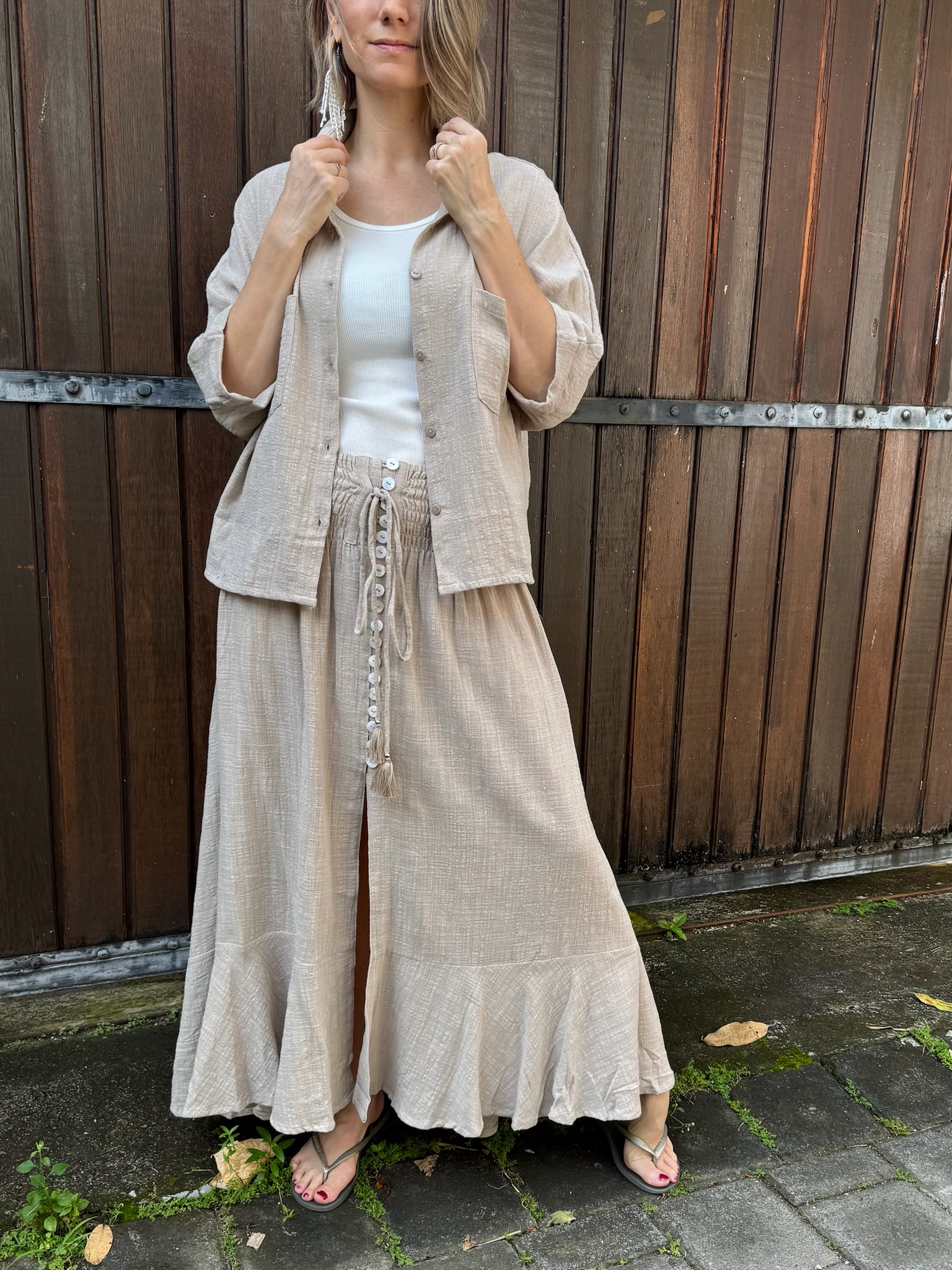 The Dakota Cotton Skirt brings effortless movement and natural texture to an easy, feminine silhouette. Crafted from lightweight cotton, it features a comfortable smocked waistband with a button-front detail and adjustable tie finished with tassels. The flowing shape and soft tiered hem create beautiful movement while keeping the look relaxed and versatile. Easy to dress up or down, the Dakota Cotton Skirt pairs naturally with simple tanks, blouses, or lightweight knits for everyday comfort and style.