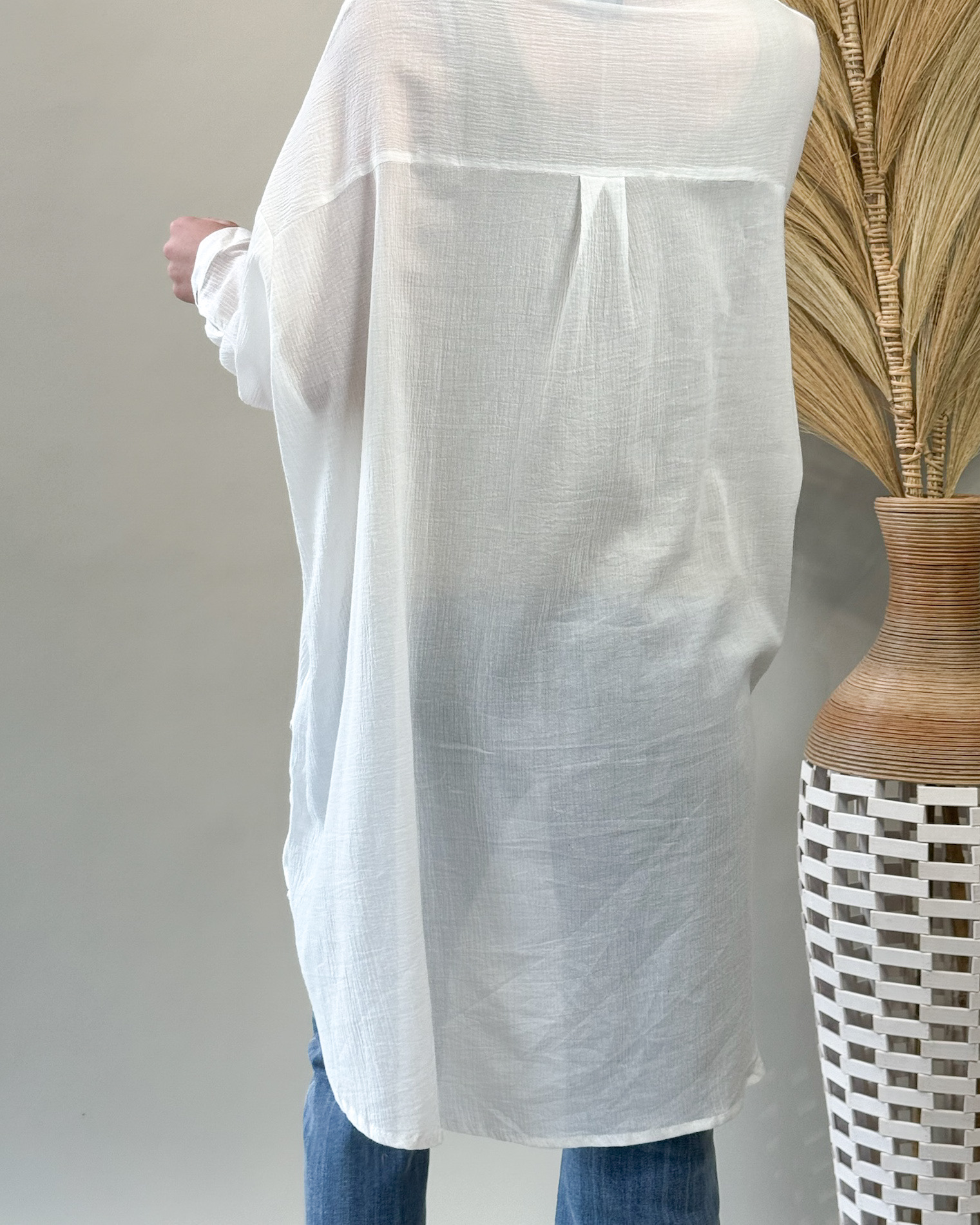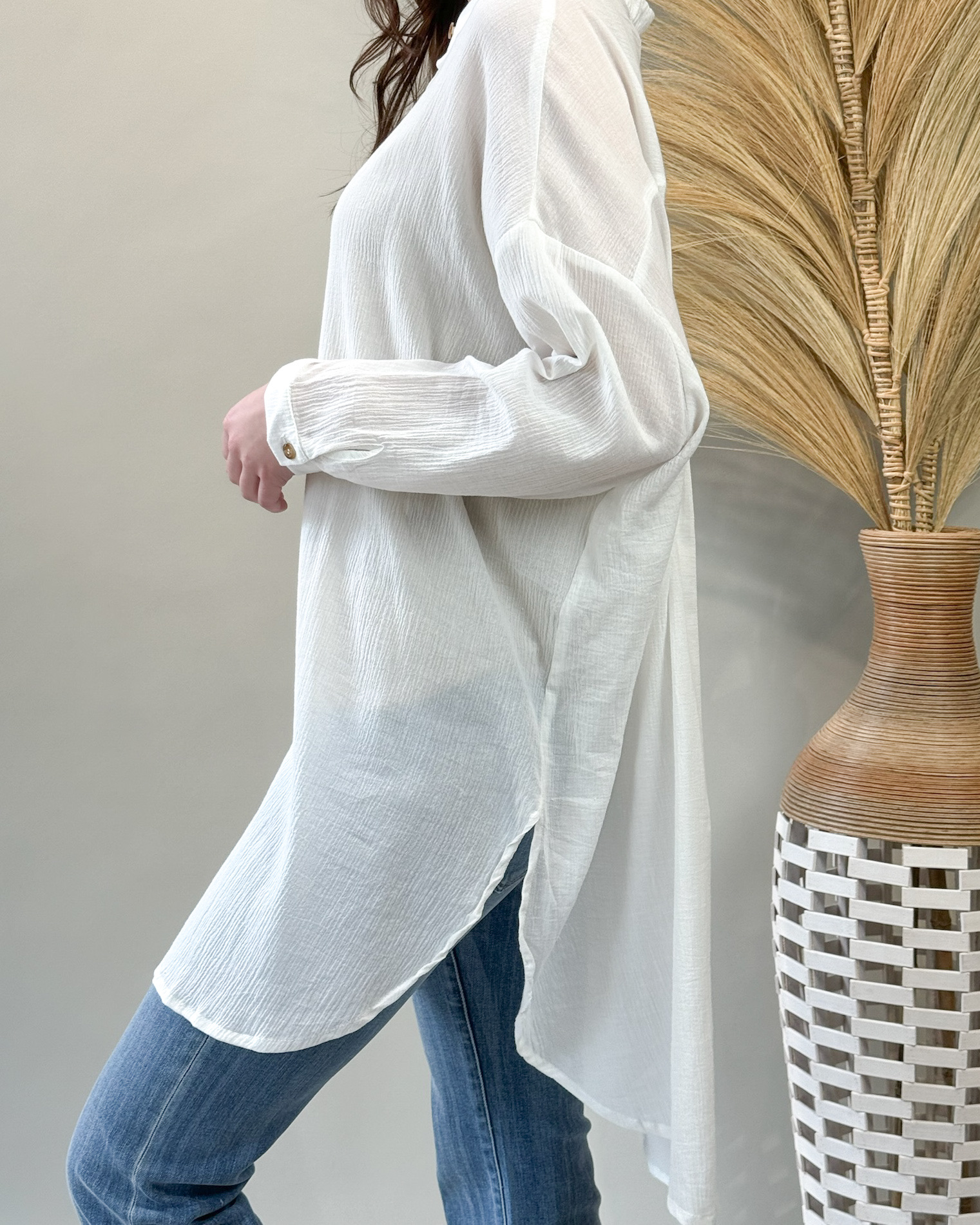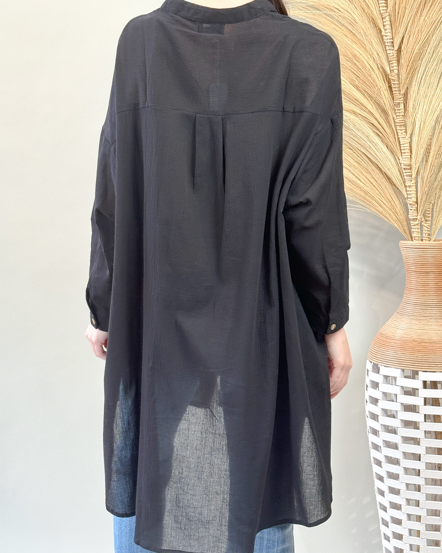 The Flow Breeze Top is the epitome of effortless sophistication and versatility. Designed with a collarless silhouette and crafted from ultralight weight fabric, this button-down top is perfect for those warm summer days when you want to stay cool and stylish. Its long sleeves provide just the right amount of coverage, while its airy construction allows for easy layering over dresses, shorts, or leggings. Whether you're dressing it up for a night out or keeping it casual for a day of errands, the Flow Breeze Top is sure to become a staple in your summer wardrobe. Experience the perfect blend of comfort and style with this must-have piece.