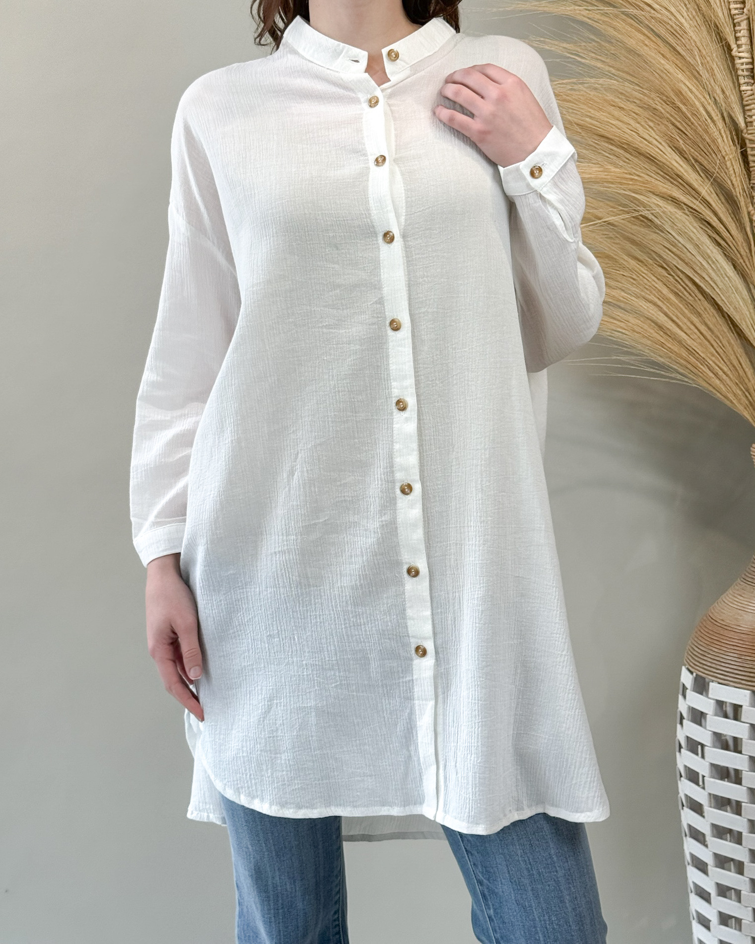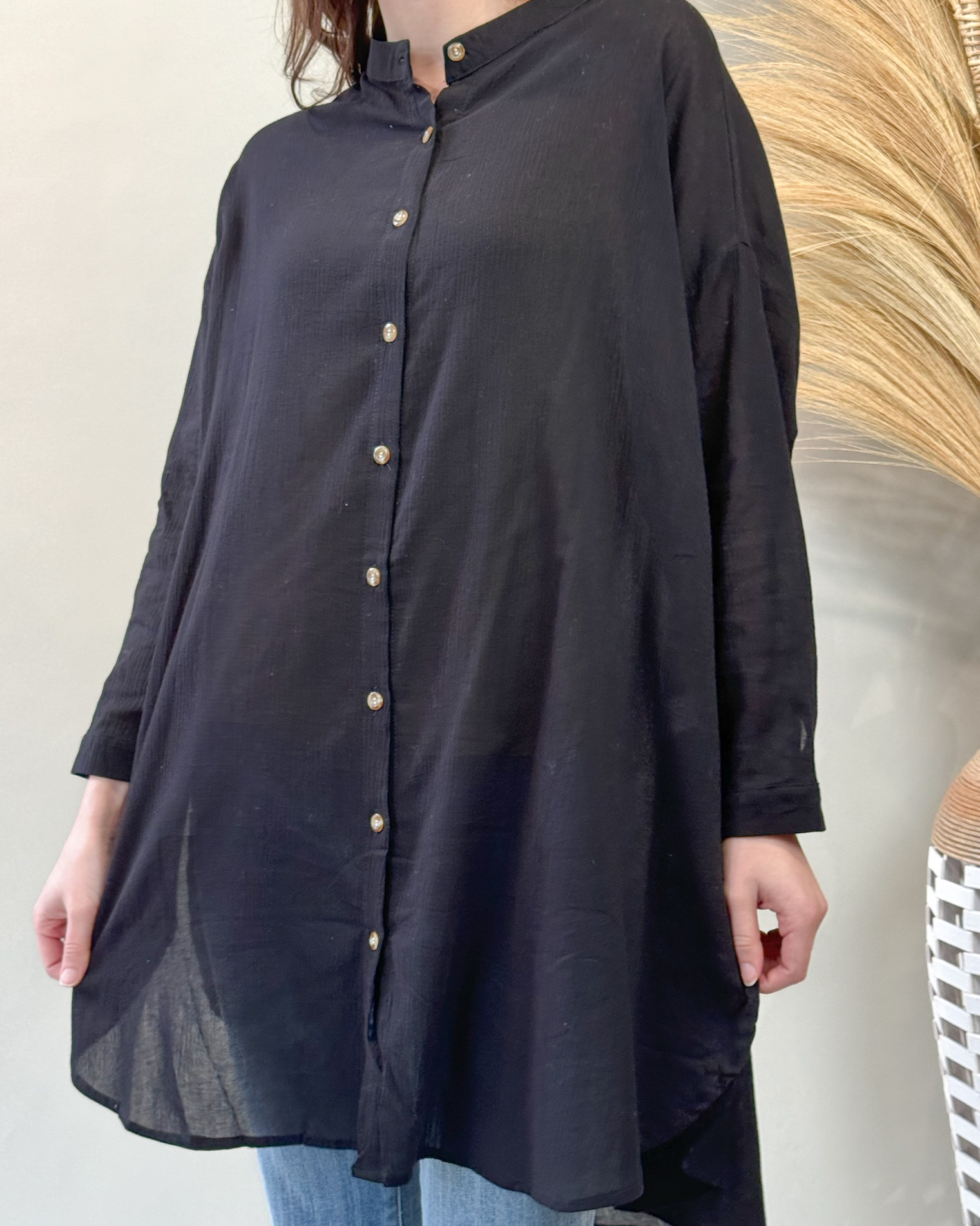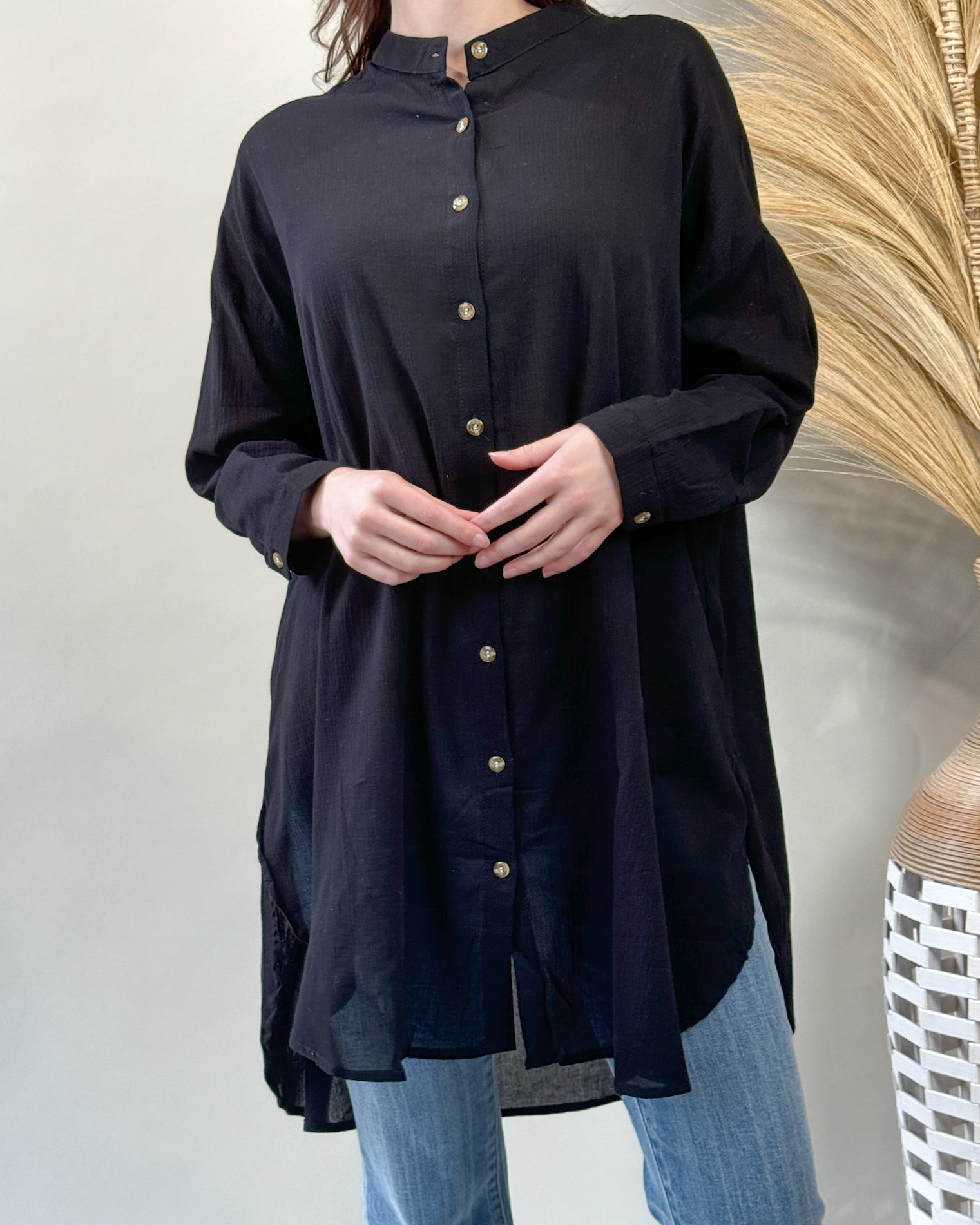 The Flow Breeze Top is the epitome of effortless sophistication and versatility. Designed with a collarless silhouette and crafted from ultralight weight fabric, this button-down top is perfect for those warm summer days when you want to stay cool and stylish. Its long sleeves provide just the right amount of coverage, while its airy construction allows for easy layering over dresses, shorts, or leggings. Whether you're dressing it up for a night out or keeping it casual for a day of errands, the Flow Breeze Top is sure to become a staple in your summer wardrobe. Experience the perfect blend of comfort and style with this must-have piece.