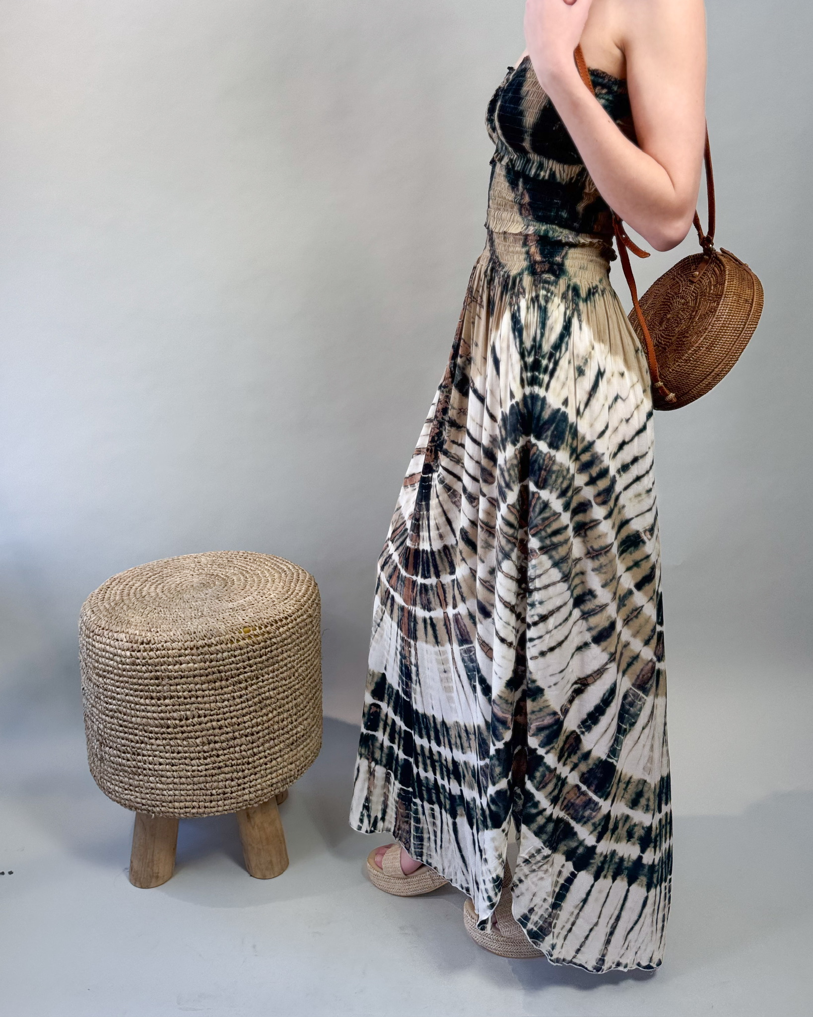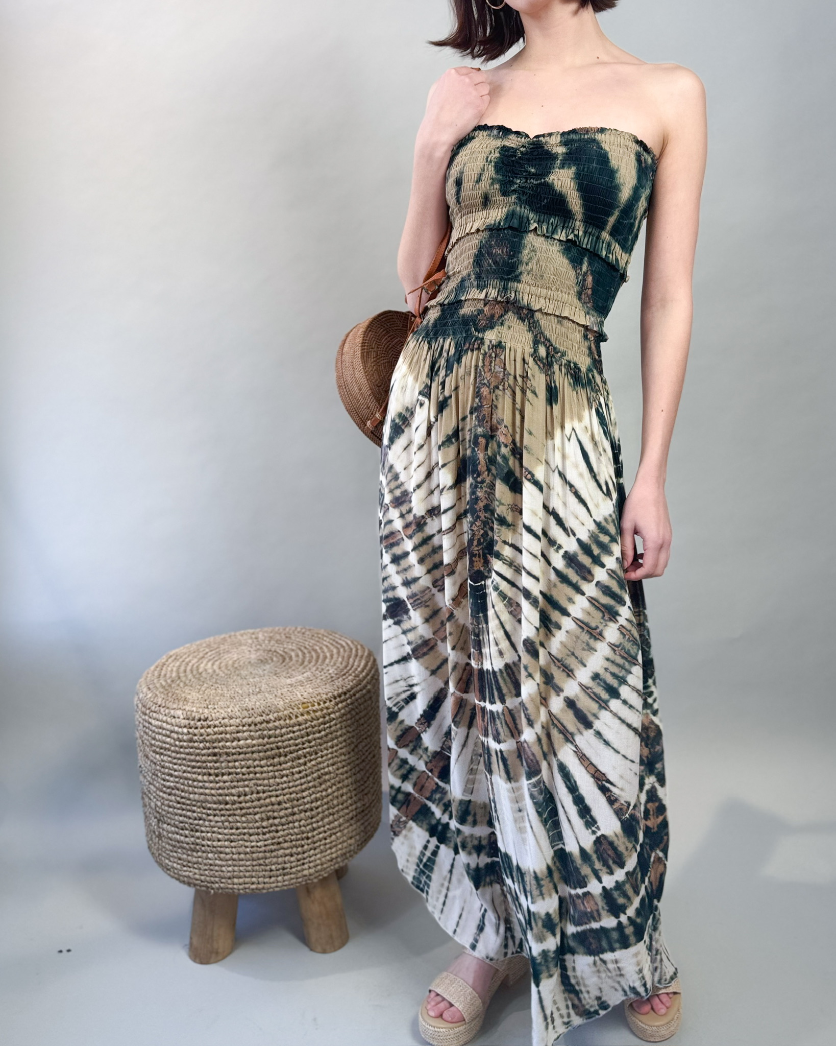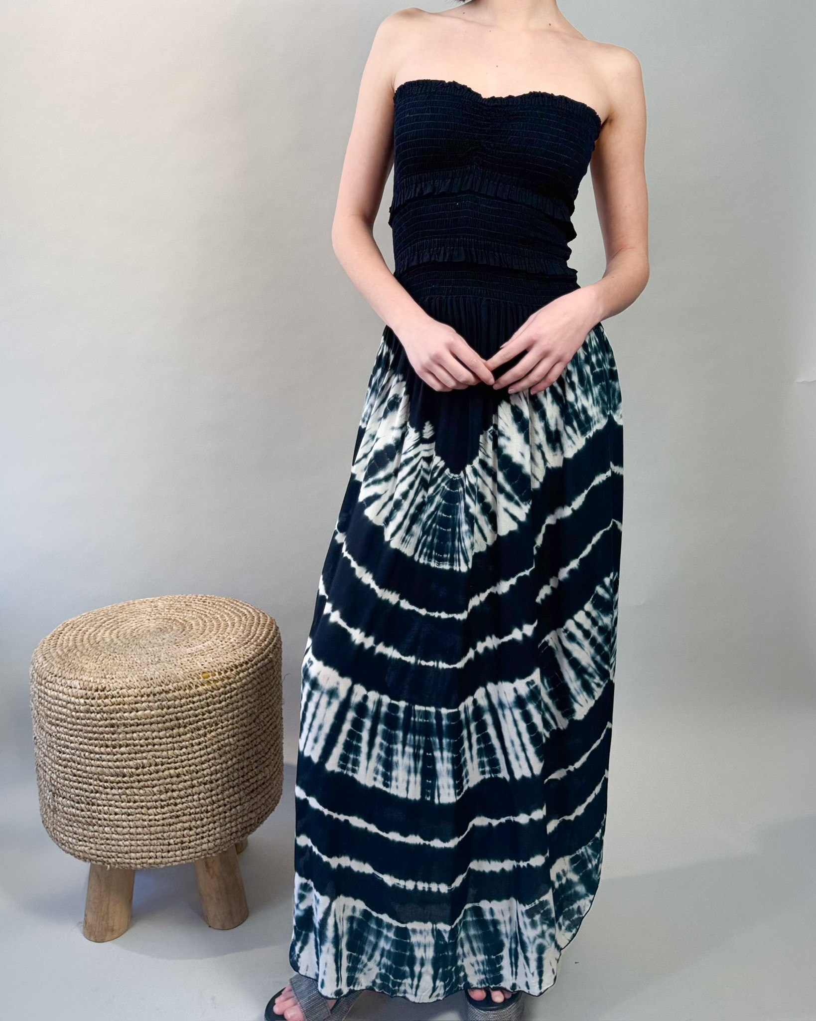 Effortlessly stylish and endlessly comfortable, the Frill Tube Top Dress is a versatile piece perfect for any occasion. The tube top features a flattering sweetheart cut, offering a feminine touch that hugs the bodice for a secure yet comfortable fit. Flowing into an ankle-length tie-dye skirt, this dress is made from ultra-soft jersey cotton, ensuring a breathable and lightweight feel. Available in two stunning color combinations—navy and white or tan, navy, and white—this dress is a must-have for easy, everyday elegance. Pair it with sandals for a relaxed look or dress it up with statement accessories.