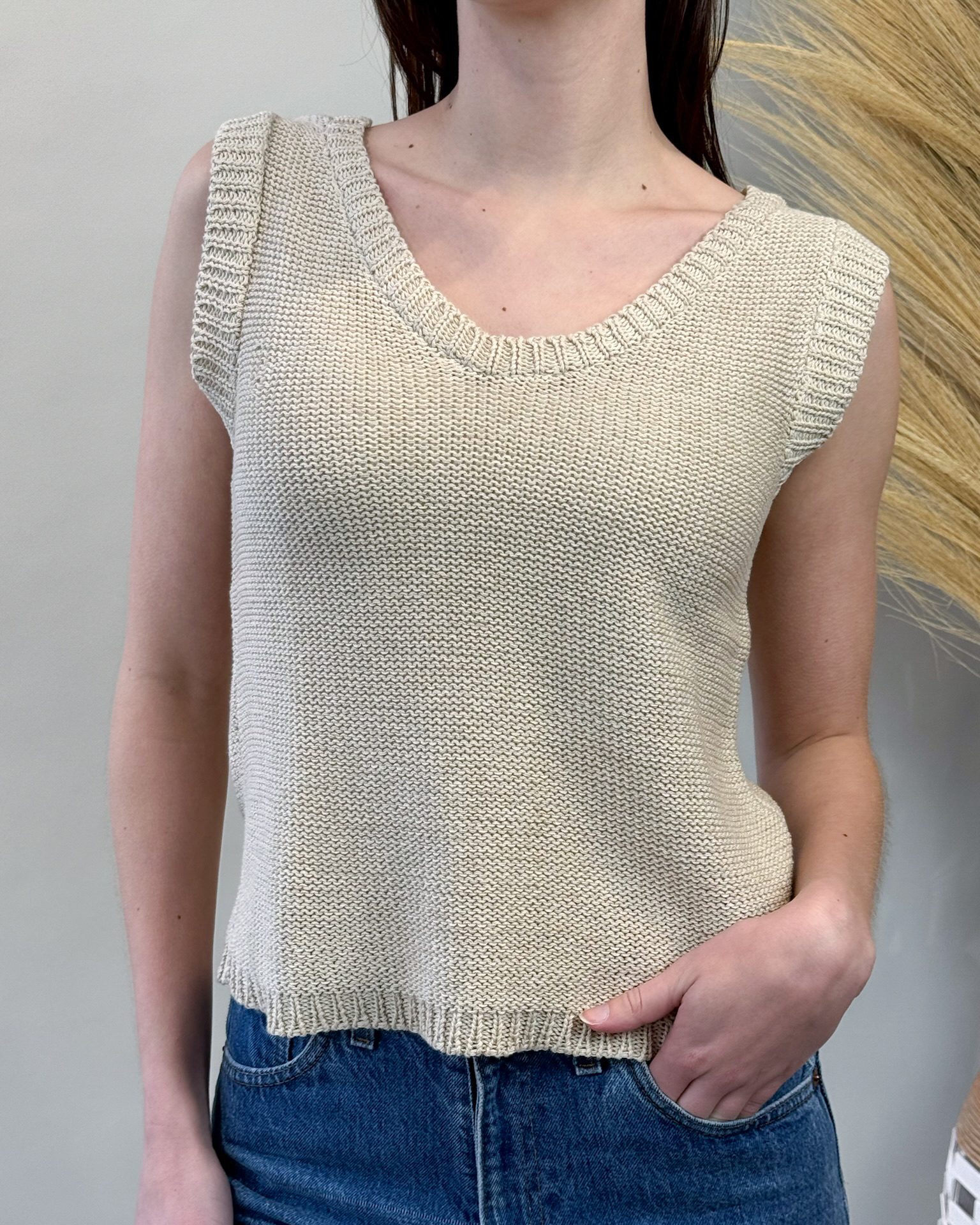 A versatile summer staple, the Kassia Tank, combines the comfort of a sweater with the breeziness of a tank top. With its v-neck design and sleeveless silhouette, it's perfect for layering or wearing on its own during the summer months. Crafted for summer comfort, this sweater tank adds a touch of effortless style to any outfit. Elevate your summer wardrobe with the versatile charm of the Kassia Tank, designed for chic layering and comfort.