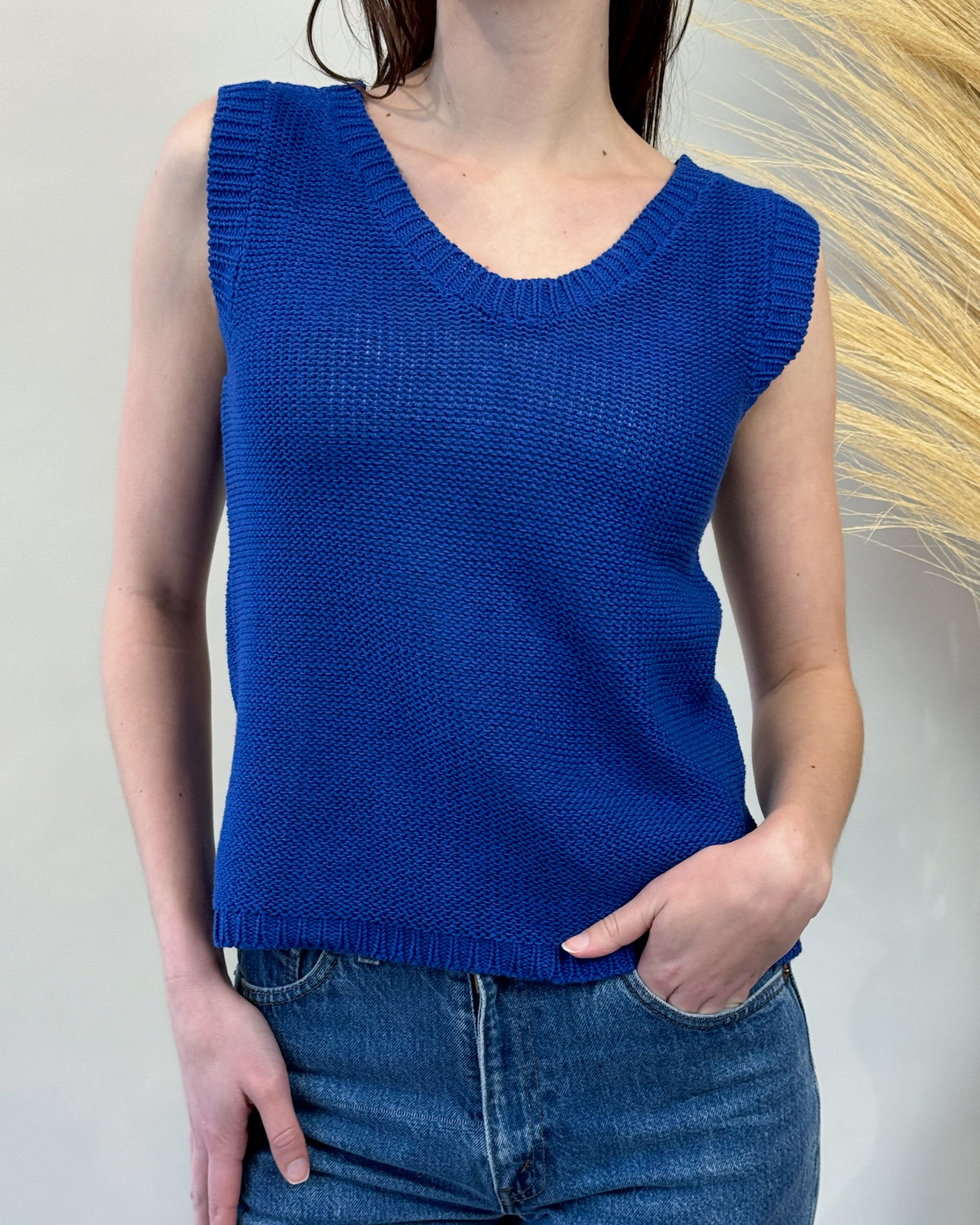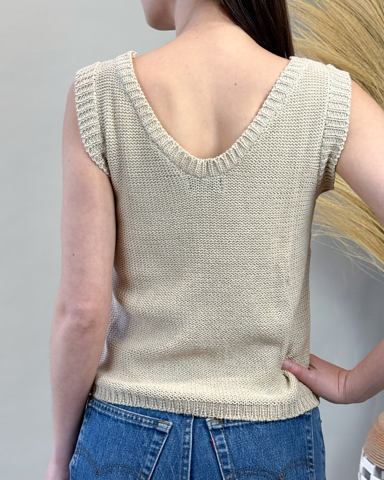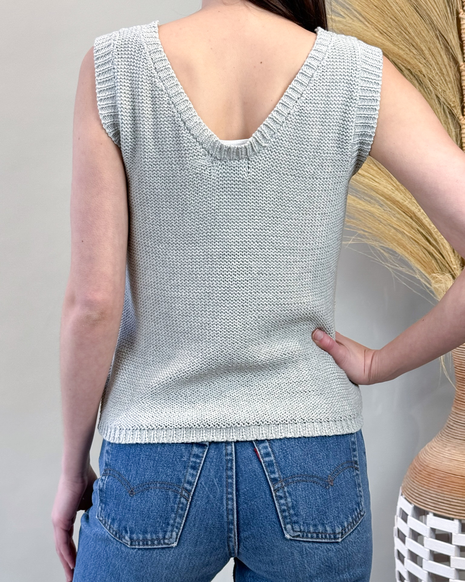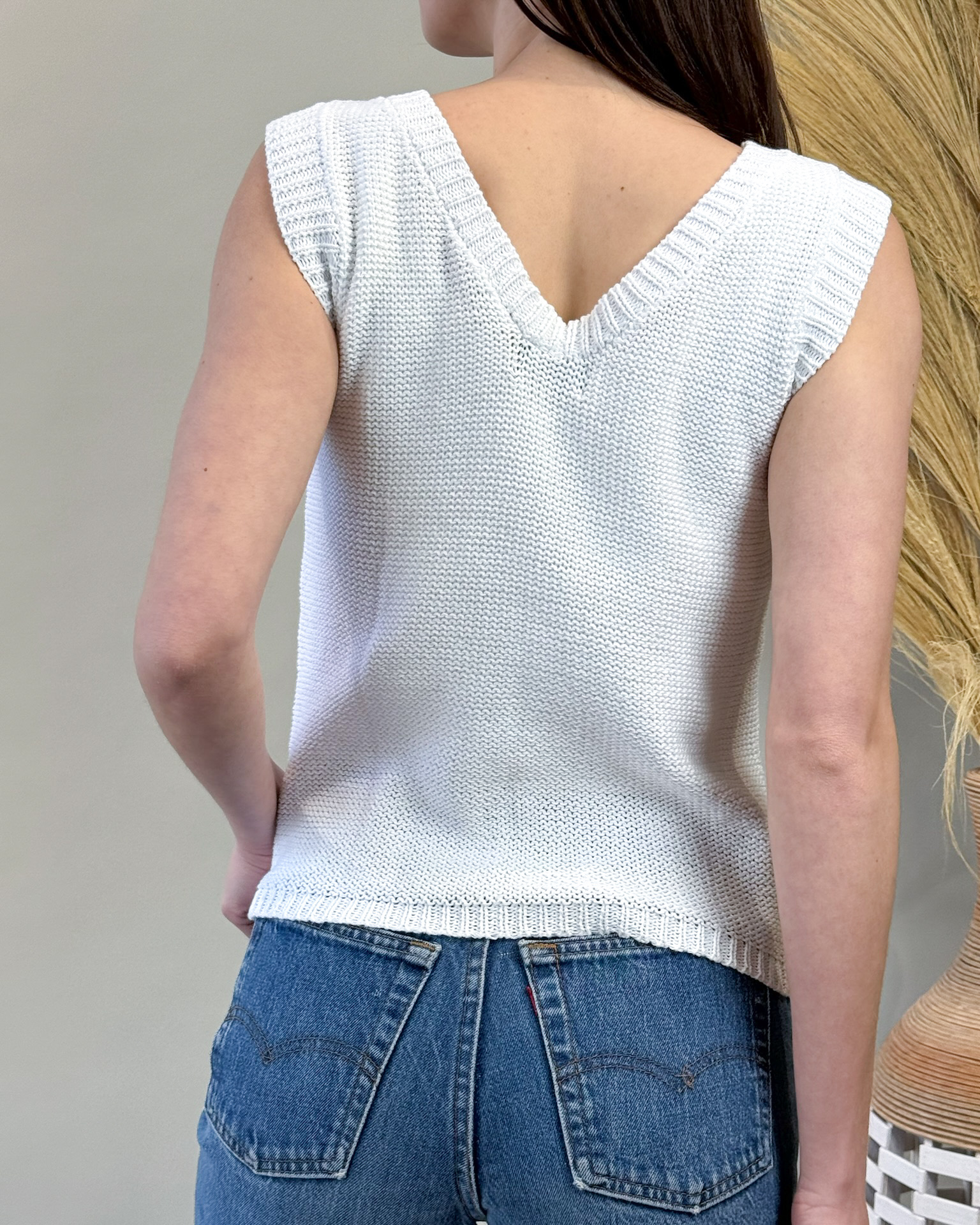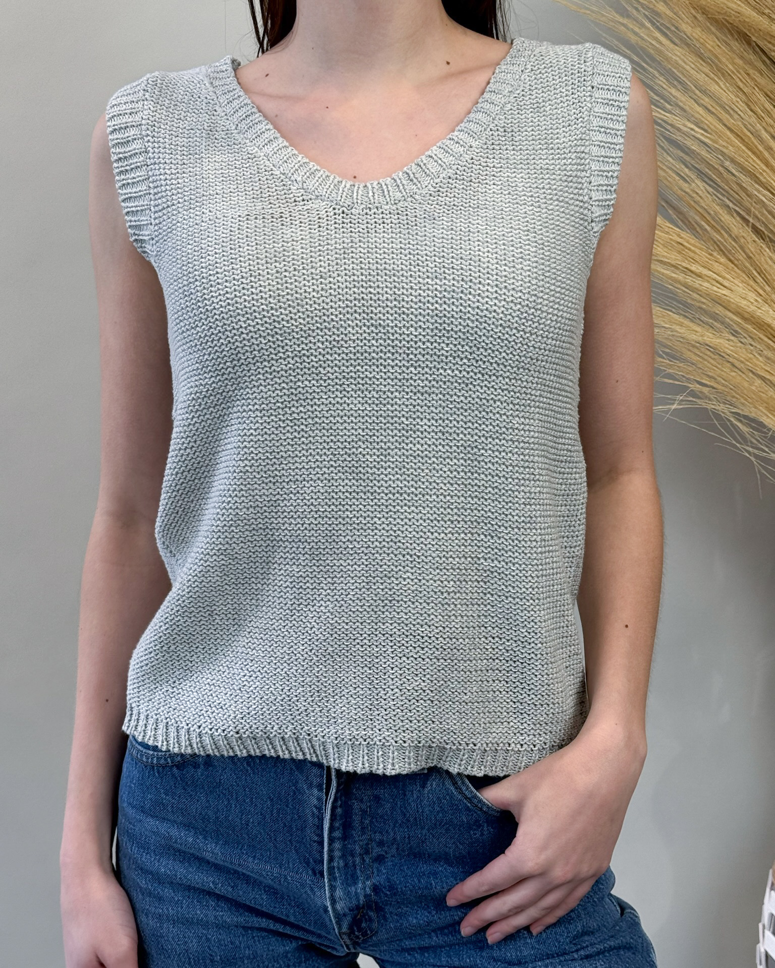 A versatile summer staple, the Kassia Tank, combines the comfort of a sweater with the breeziness of a tank top. With its v-neck design and sleeveless silhouette, it's perfect for layering or wearing on its own during the summer months. Crafted for summer comfort, this sweater tank adds a touch of effortless style to any outfit. Elevate your summer wardrobe with the versatile charm of the Kassia Tank, designed for chic layering and comfort.