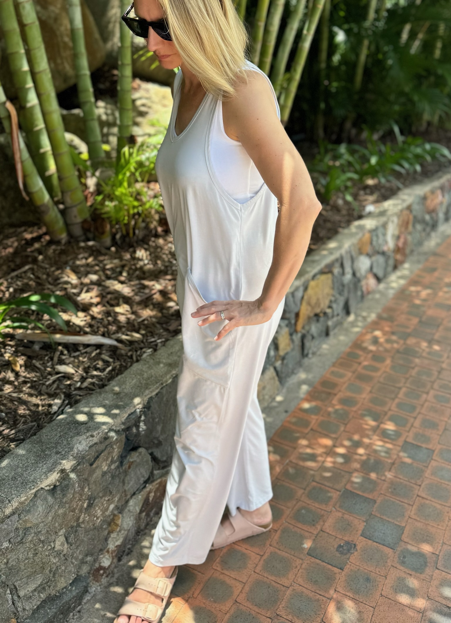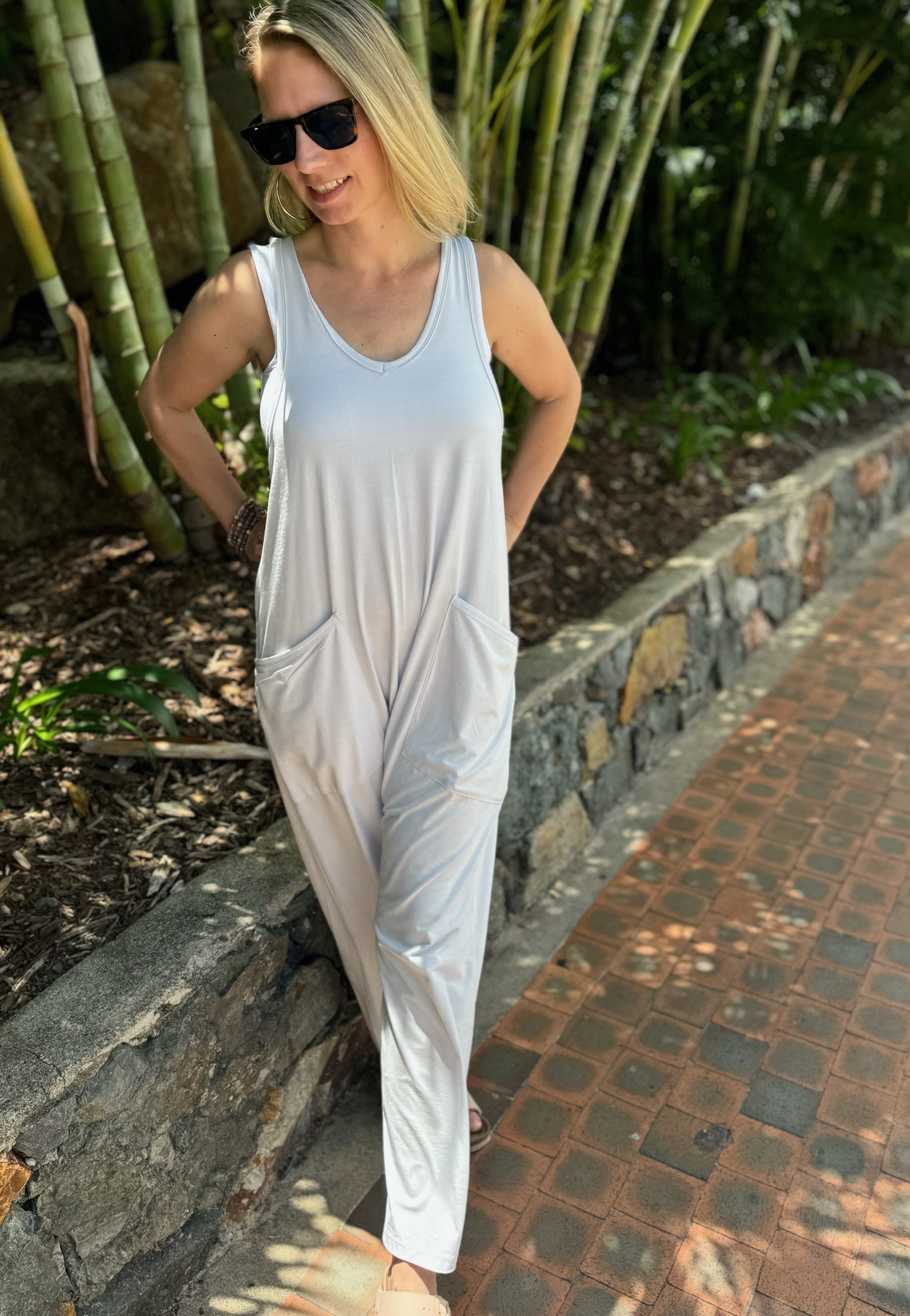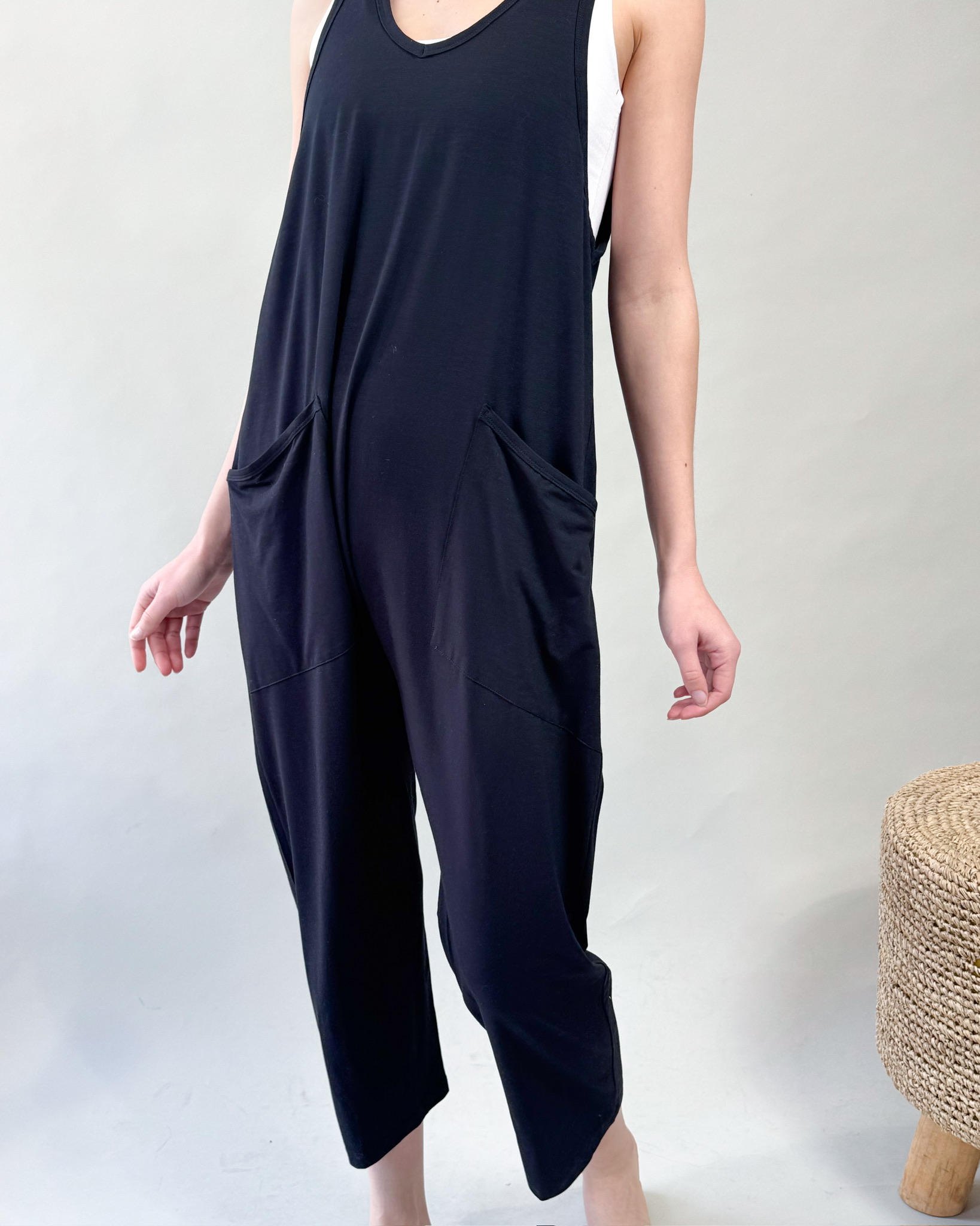 Effortlessly stylish and endlessly comfortable, the Kyrie Jumper is your go-to for laid-back days and relaxed elegance. Made from ultra-soft jersey knit fabric, it drapes beautifully for a flattering yet free-flowing fit. Designed with deep side pockets for functionality and a scoop neckline for a touch of casual charm, this jumpsuit is perfect for layering or wearing on its own. Whether you're lounging at home, strolling through the weekend market, or heading out for a coffee date, the Kyrie Jumper is all about easygoing style with a cozy feel.