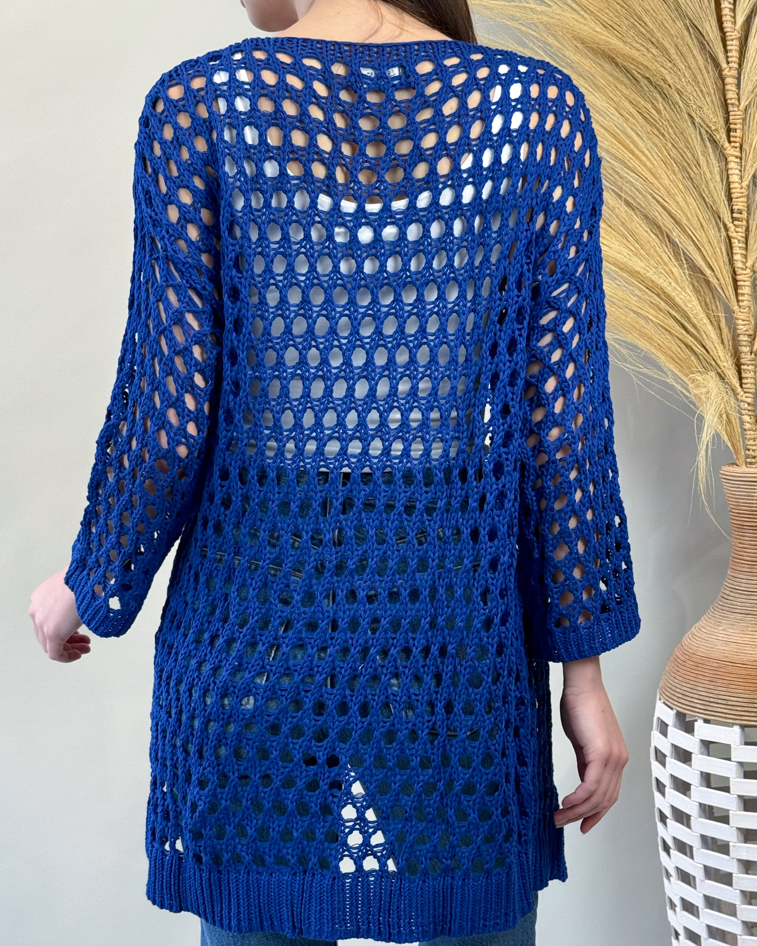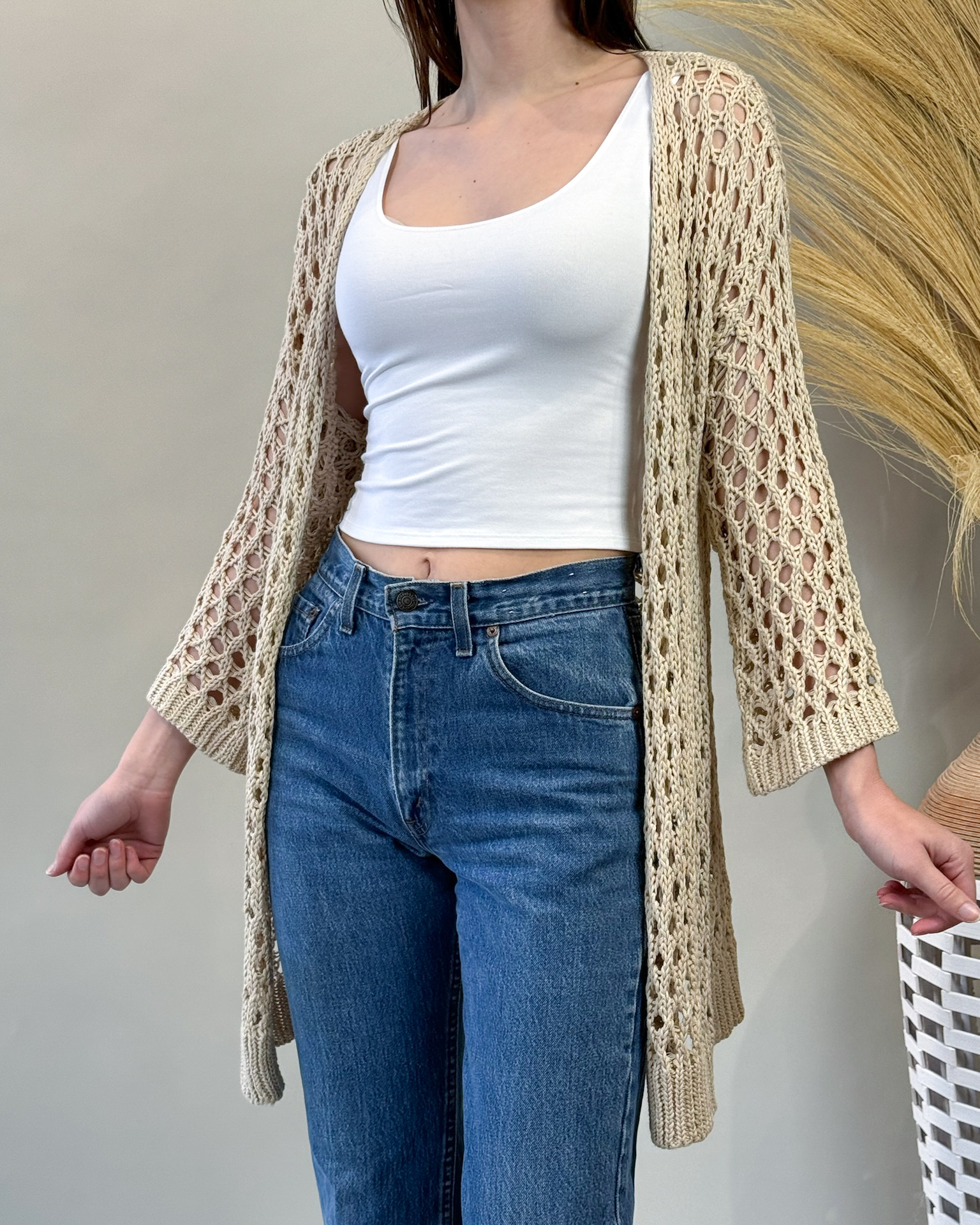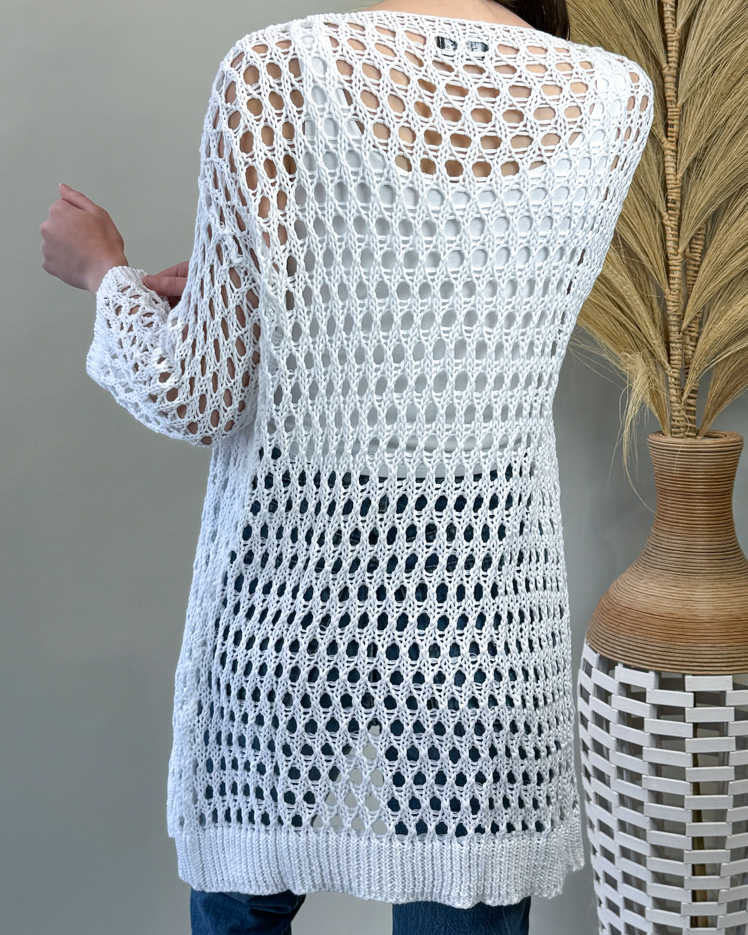 The Larissa Long Cardigan is the perfect summer layering piece for effortless style and comfort. Crafted from a wide knit, this long sleeve cardigan offers breathability and versatility for warmer days. With its long length falling around mid-thigh, it's ideal for adding a touch of sophistication to any outfit. Elevate your summer wardrobe with the timeless appeal of the Larissa Long Cardigan, designed to keep you chic and comfortable in any season.