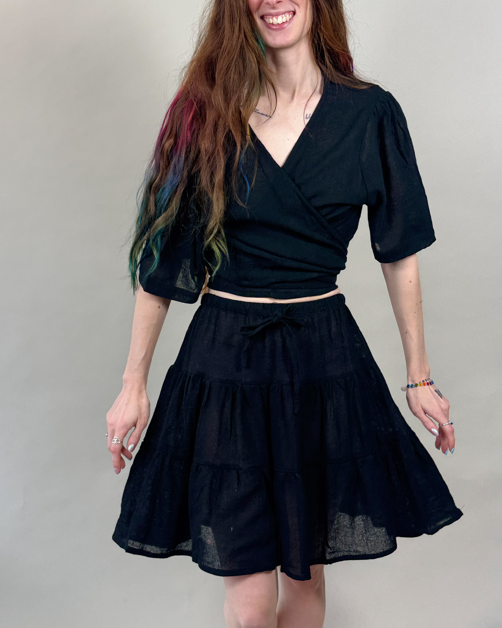 Rooted in softness and subtle structure, the Rami Asa Top brings quiet sophistication to everyday dressing. Made from a textured cotton-linen blend, this wrap-style blouse features a flattering V neckline, gentle puff sleeves, and long ties that can be knotted in front or wrapped around to the back for a more defined waist.