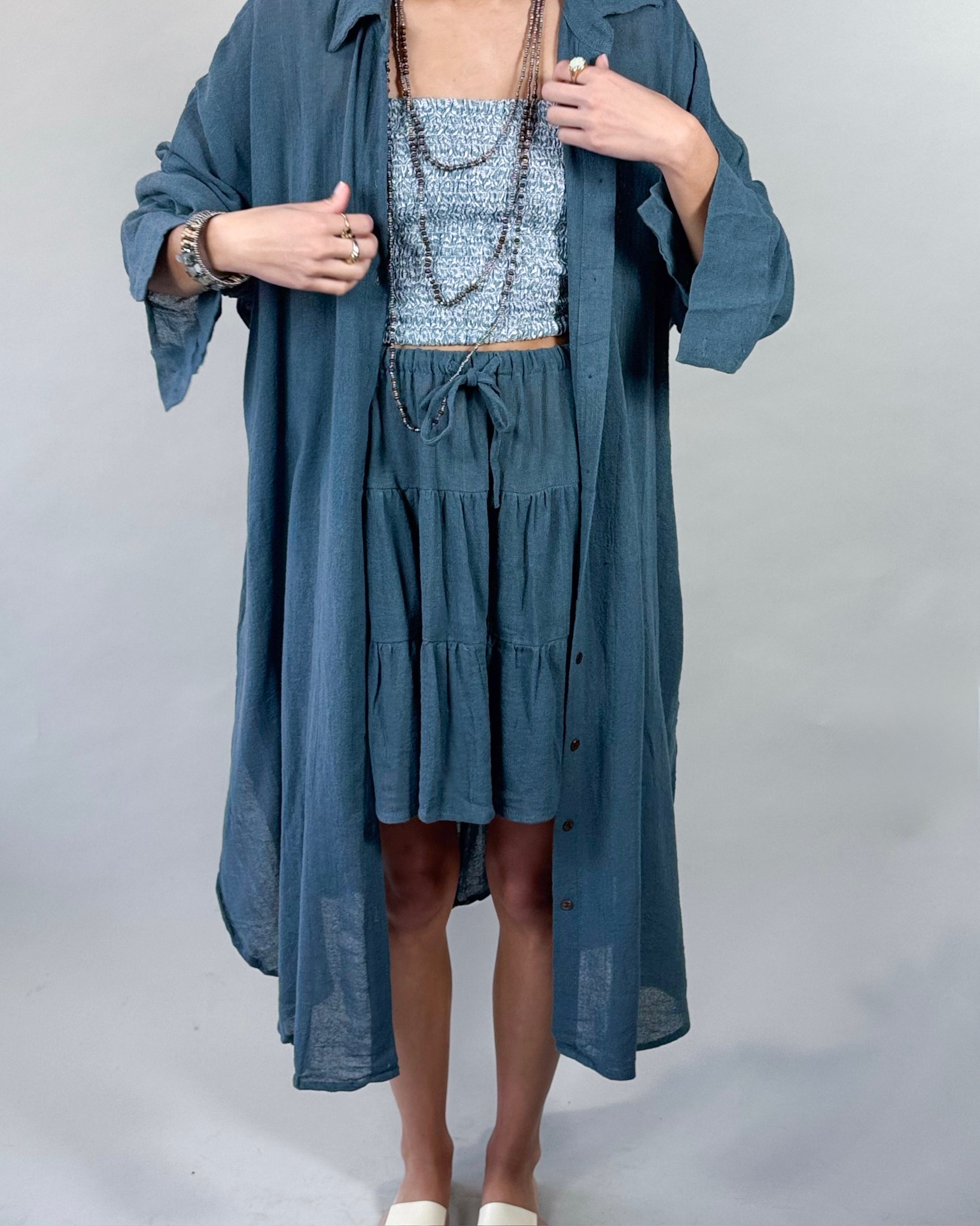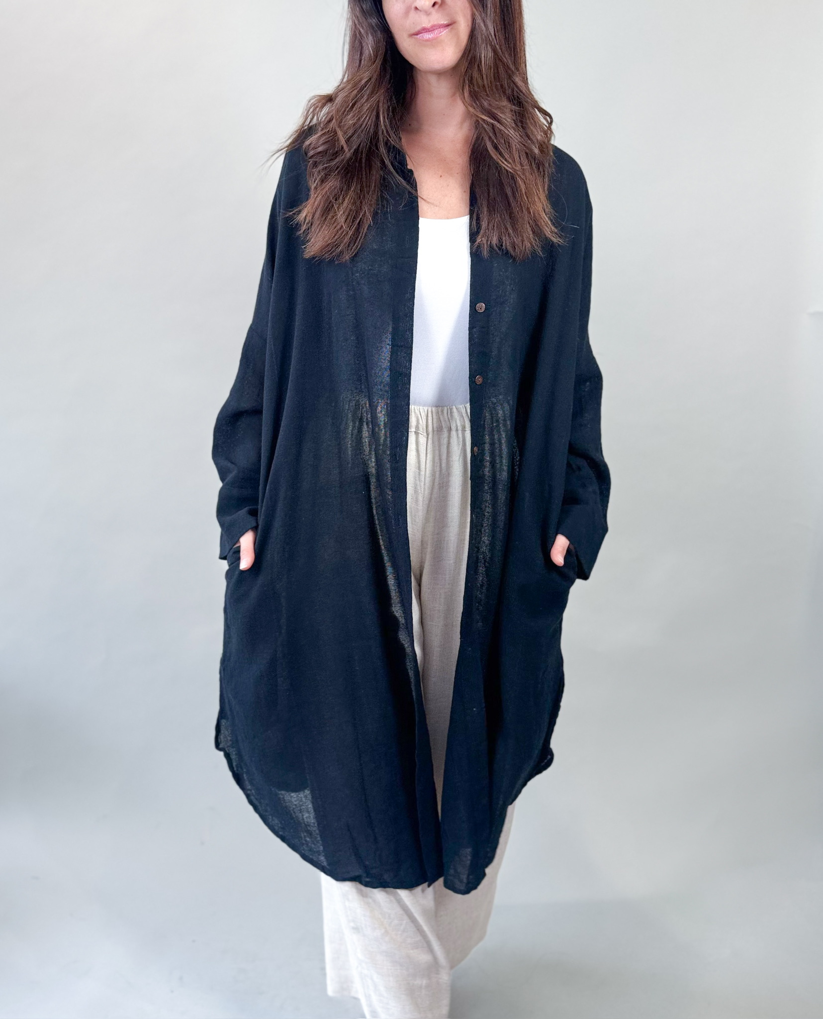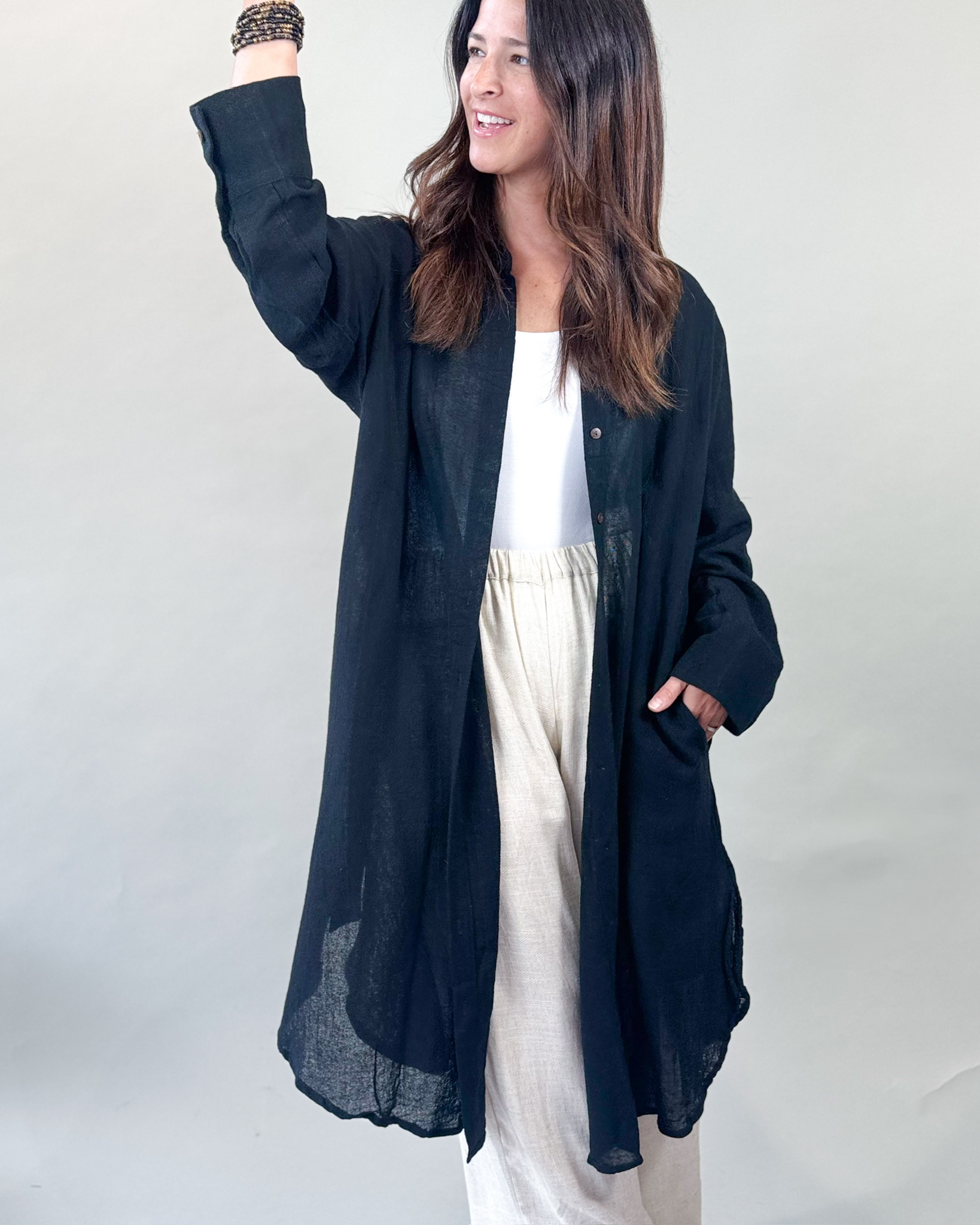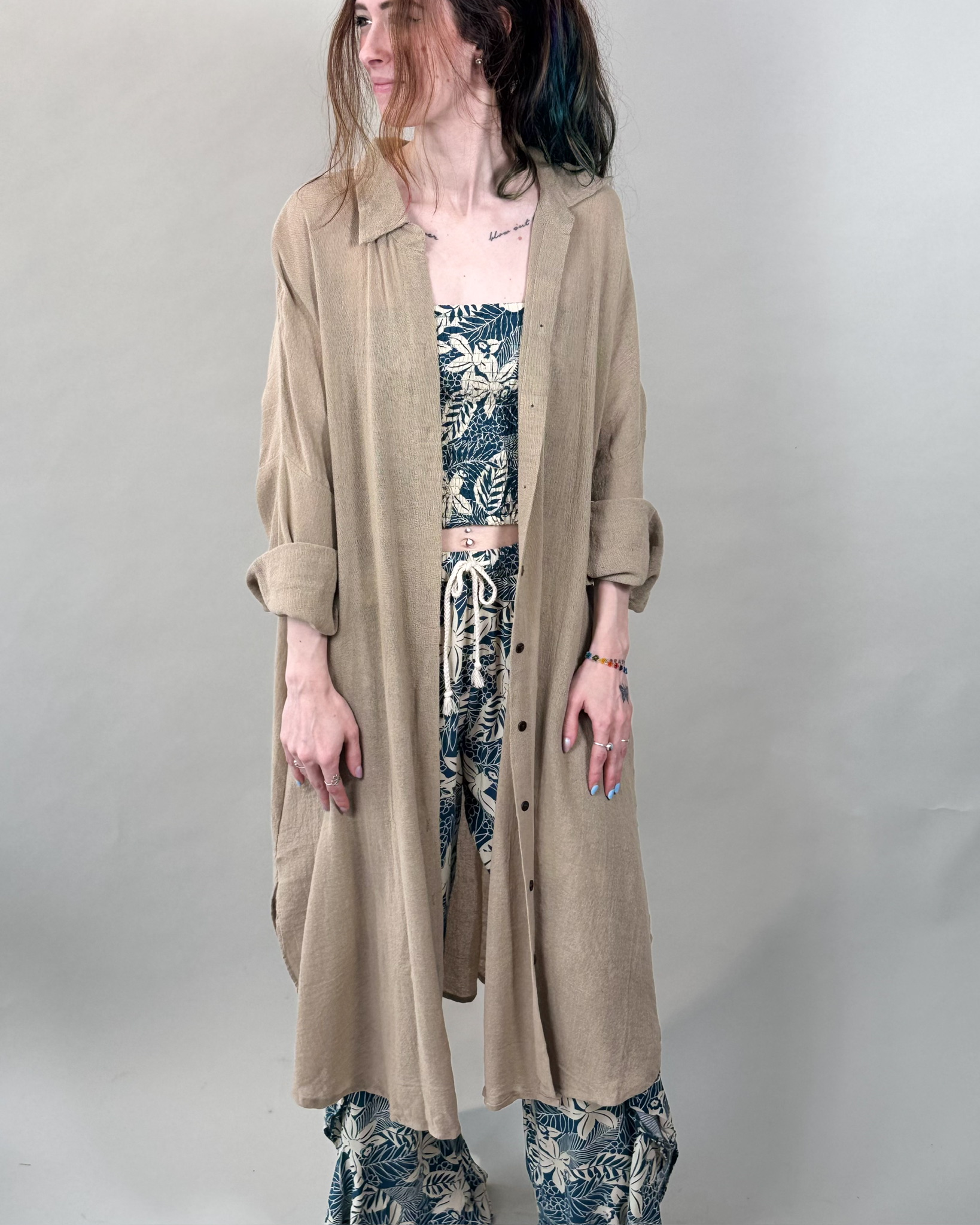 Easygoing elegance meets everyday versatility in the Rami Dahlia Tunic by Figwood. Made from breathable, textured rami fabric, this lightweight button-down offers an airy, relaxed silhouette that can be styled open over your favorite outfit or buttoned up and worn as a dress. Its flowy drape, natural texture, and soft feel make it a go-to for layering through every season.