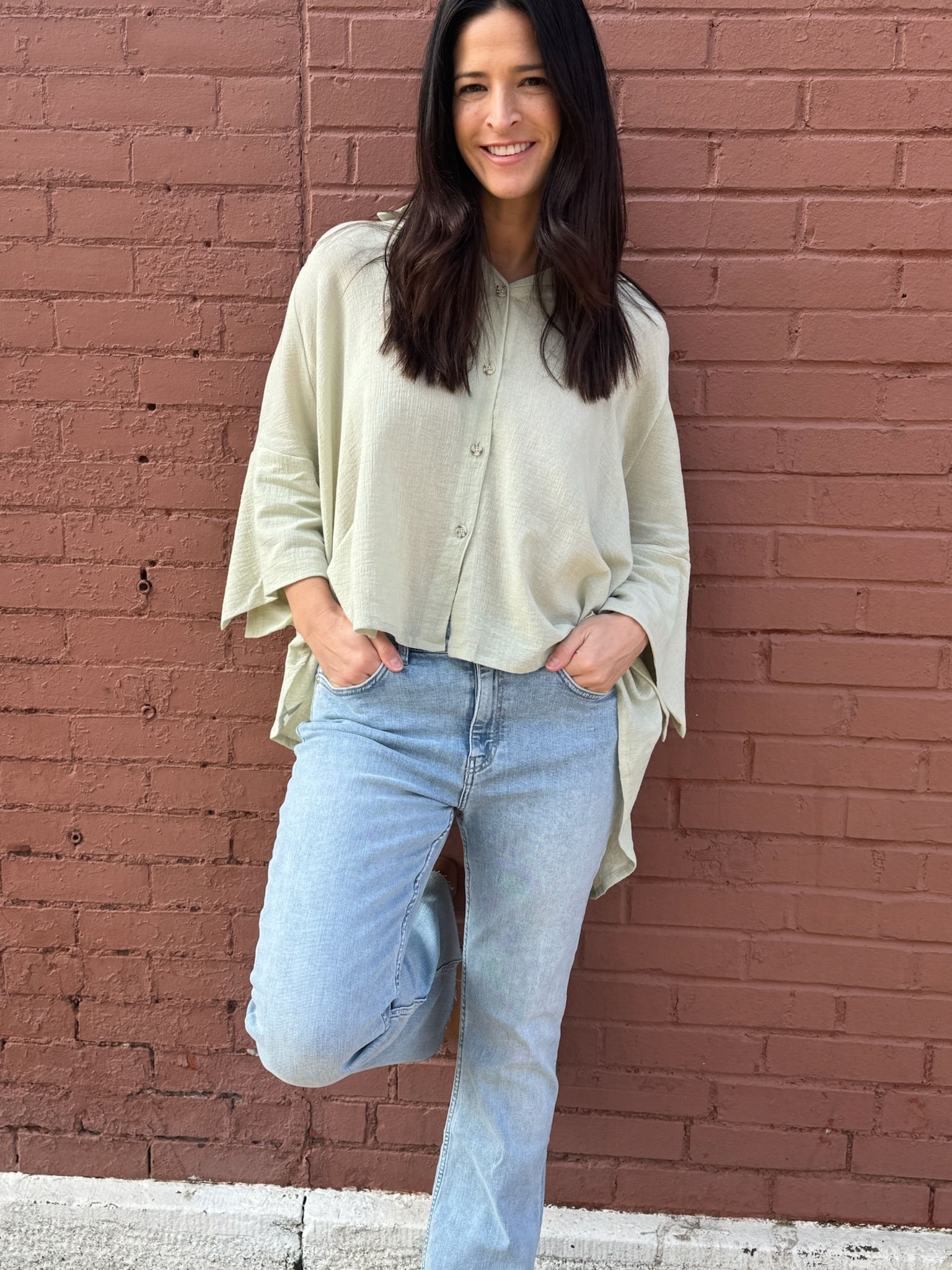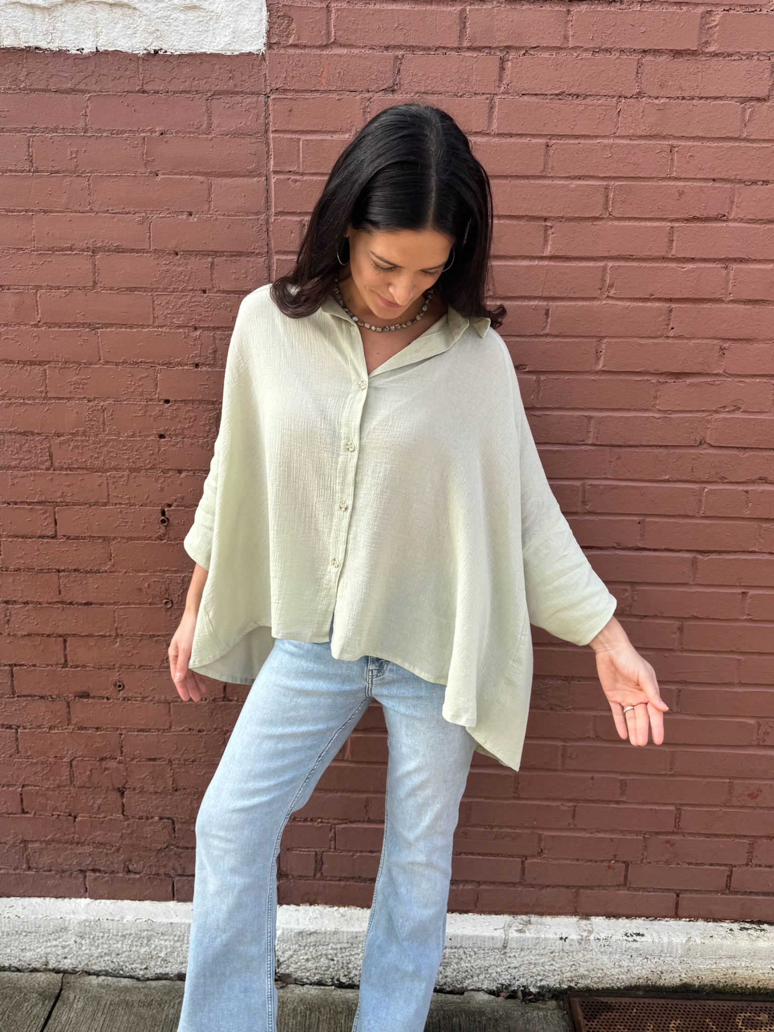The Sas Button Top is a 100% cotton, airy layer designed for effortless everyday style. It's loose, flowing silhouette, soft collar, and front button detail, it offers a balance of structure and ease. The wide sleeves and lightweight fabric create beautiful movement while keeping the feel breathable and comfortable. Easy to pair with trousers, skirts, or layered over a simple tank, the Sas Button Top brings a clean, relaxed elegance to any look.