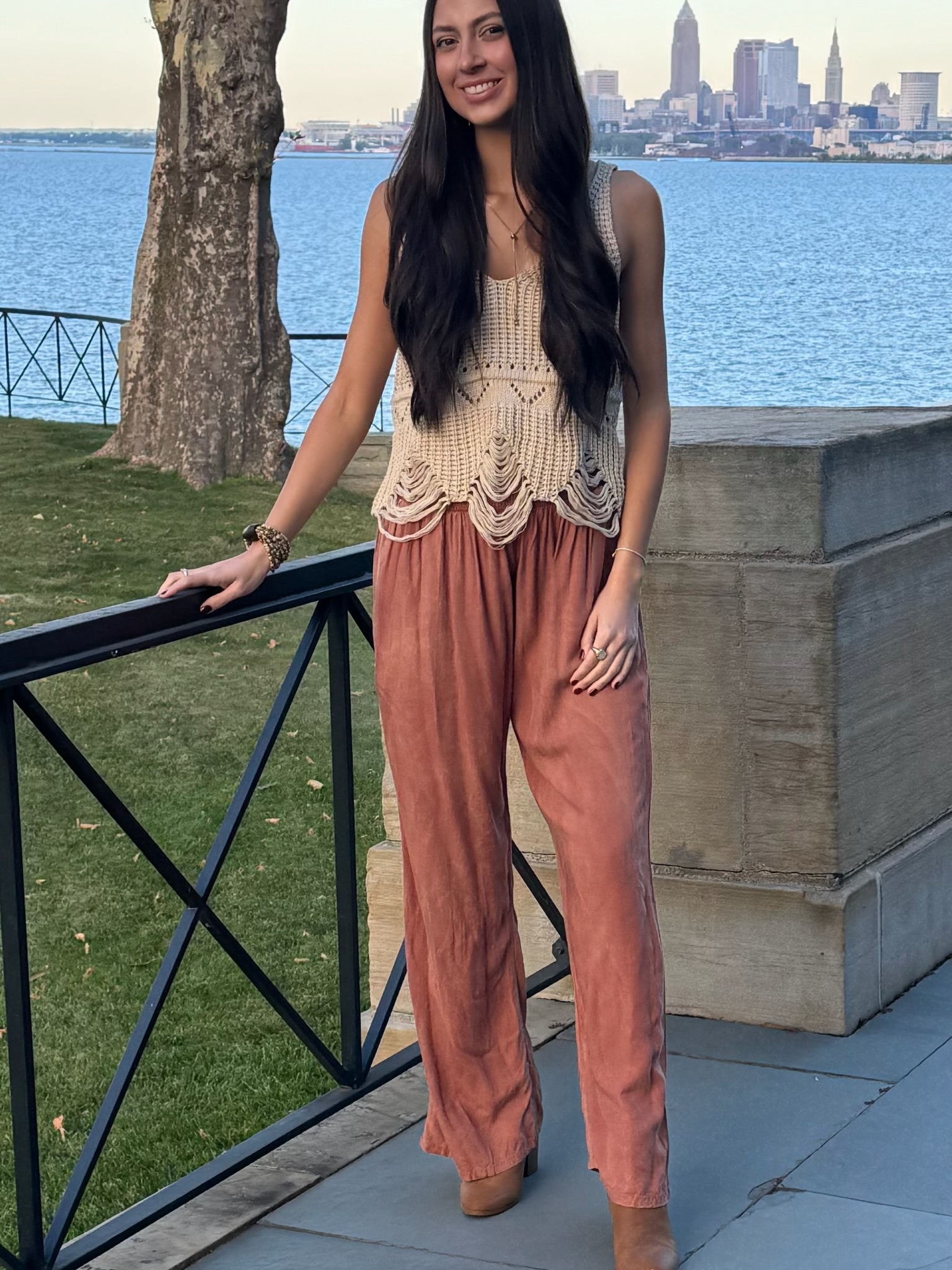 The Stevie Sweater Tank by Figwood is an effortless blend of artistry and ease. Handcrafted in small batches, this knit tank features a relaxed fit with a flattering V-neckline and wide straps for comfortable wear. Its standout detail is the textured open-weave hem, where diamond knit patterns transition into fringe-like drops, giving the piece a playful, bohemian edge. Lightweight yet substantial, it’s a versatile style for warm days or layered under a cardigan when the weather cools.