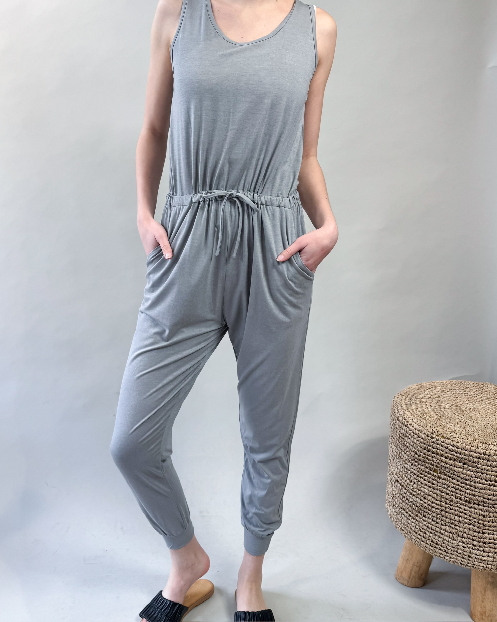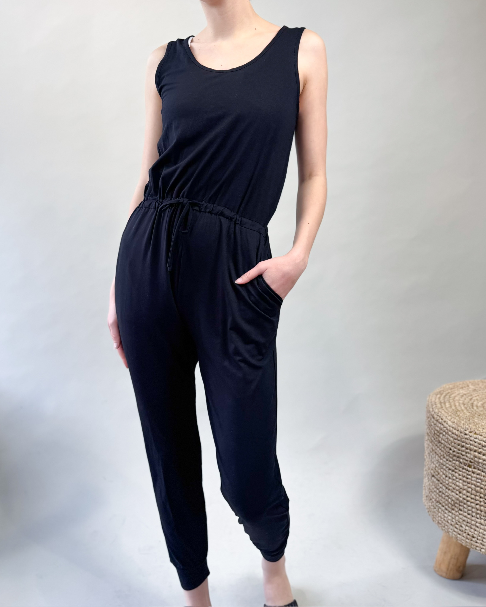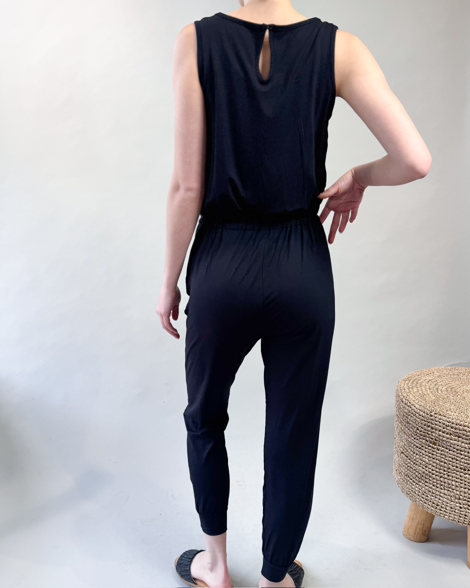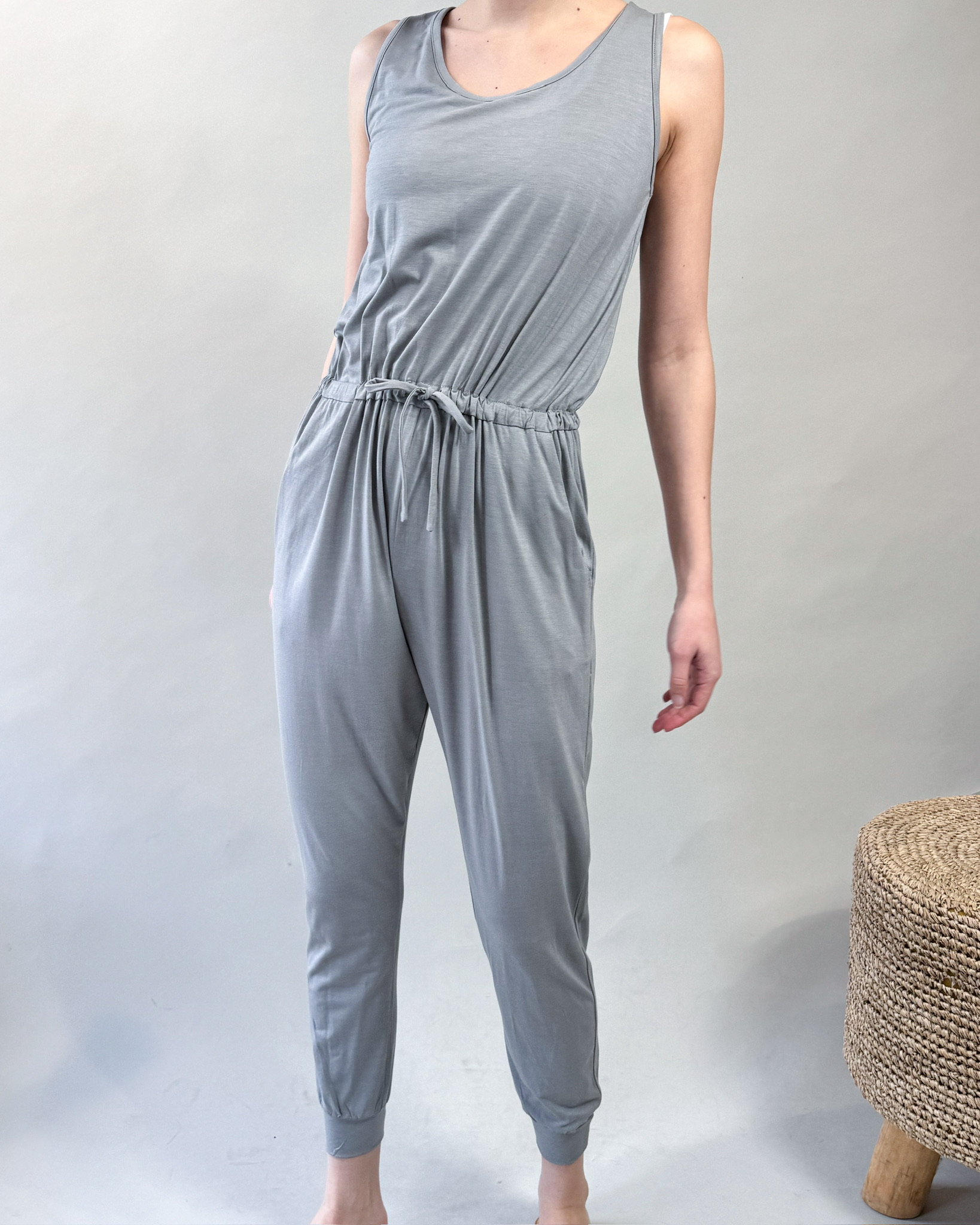 Designed for movement and ease, the Wanderlust Jumpsuit is your go-to for effortless style. Crafted from ultra-soft jersey knit, this one-piece features a relaxed yet flattering fit with a tapered leg for a modern touch. The sleeveless design and adjustable tie waist create a versatile silhouette, while the front pocket adds a functional detail. Whether you're exploring new places or embracing everyday comfort, this sustainably made, small-batch piece from Figwood is the perfect companion.