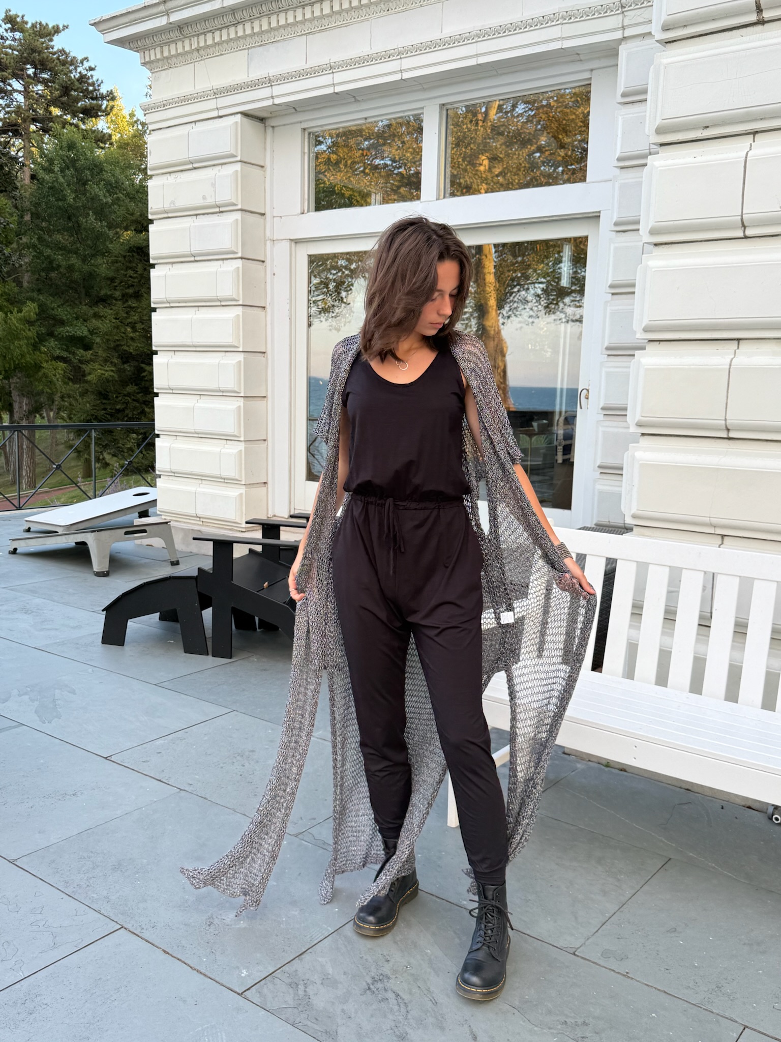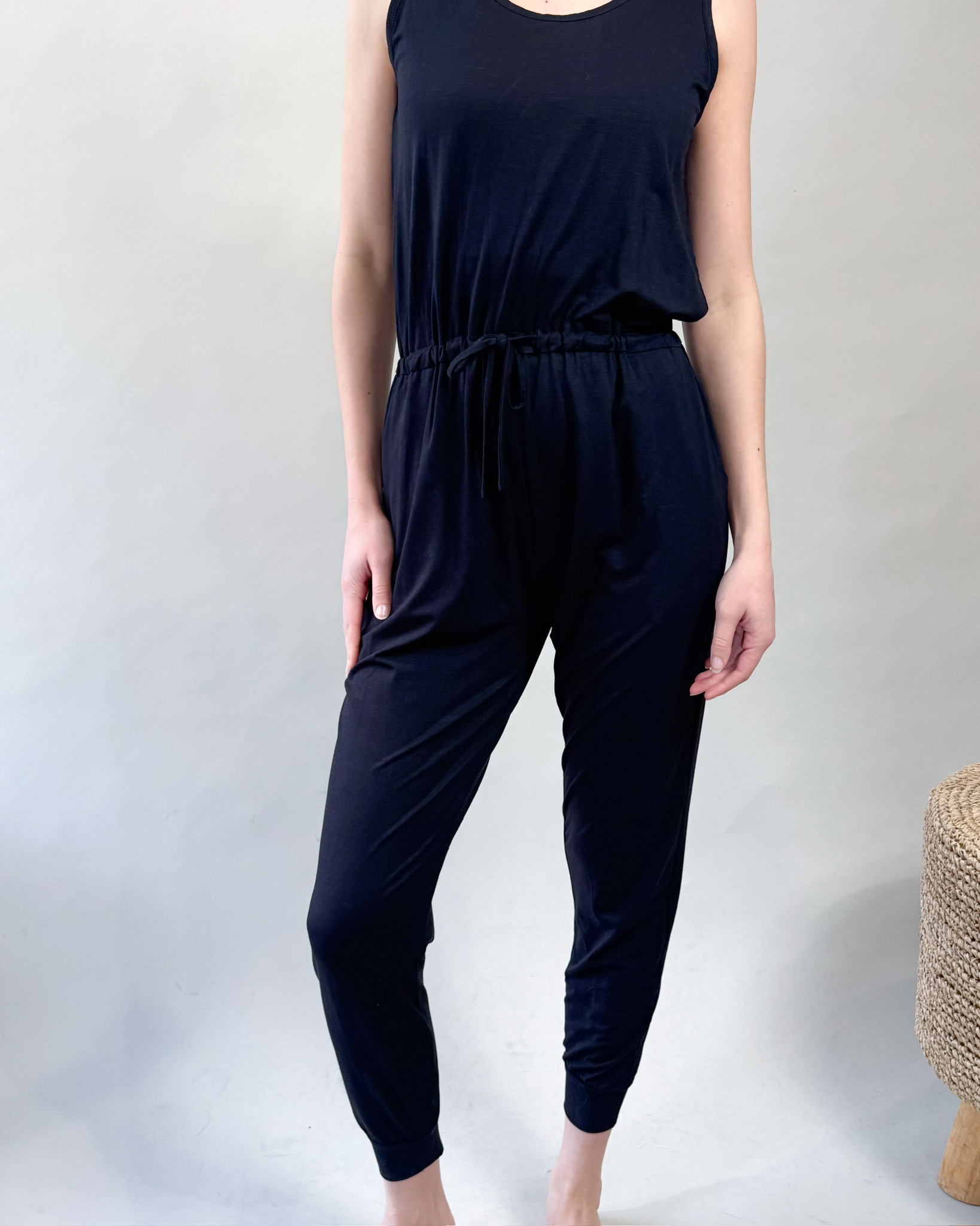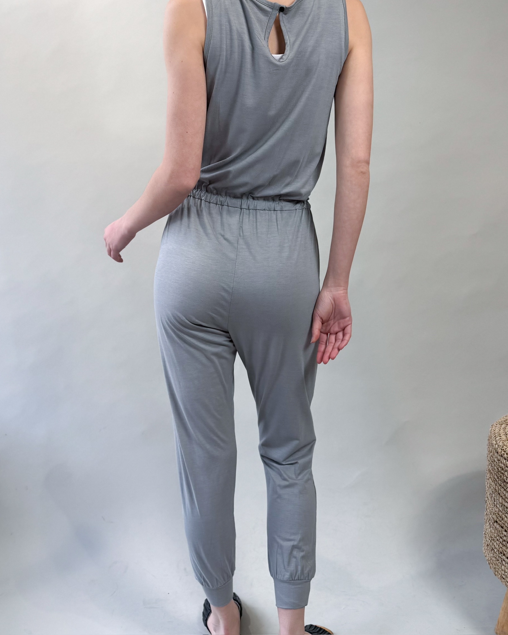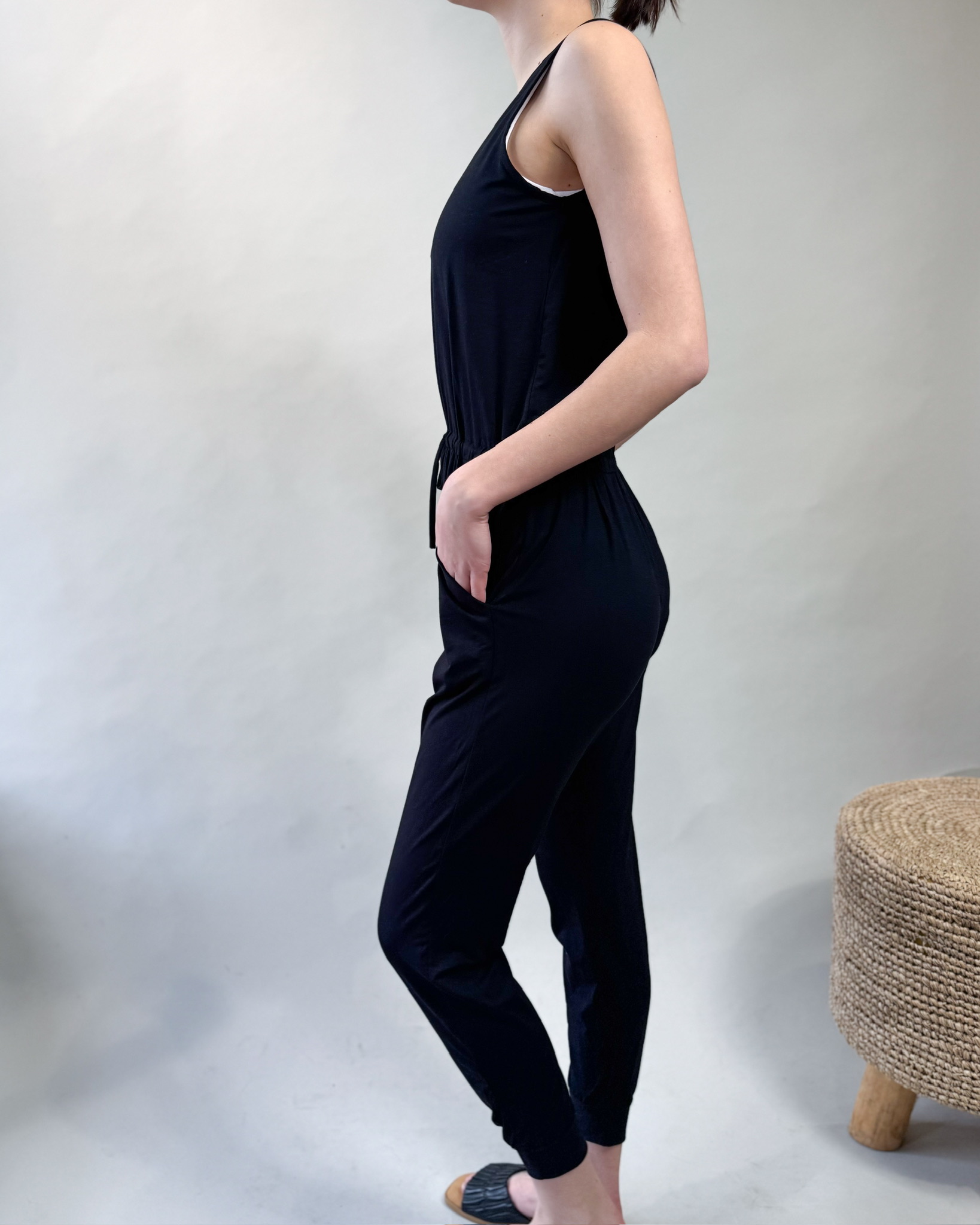 Designed for movement and ease, the Wanderlust Jumpsuit is your go-to for effortless style. Crafted from ultra-soft jersey knit, this one-piece features a relaxed yet flattering fit with a tapered leg for a modern touch. The sleeveless design and adjustable tie waist create a versatile silhouette, while the front pocket adds a functional detail. Whether you're exploring new places or embracing everyday comfort, this sustainably made, small-batch piece from Figwood is the perfect companion.