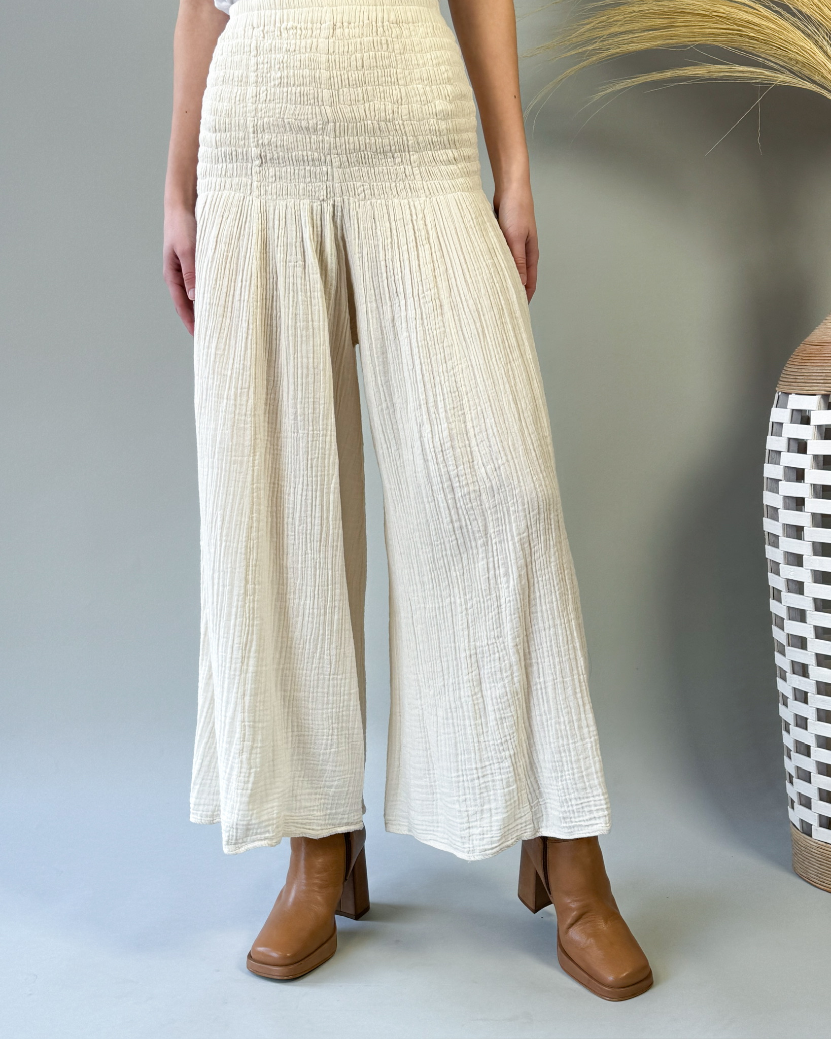 The Yoko Cotton Gauze Pants, crafted from soft cotton fabric for ultimate comfort. These pants feature a high waist and smocked waistband, ensuring a flattering fit for all body types. With their breezy feel and stylish design, the Yoko Gauze Pants are perfect for adding a touch of effortless elegance to any outfit.